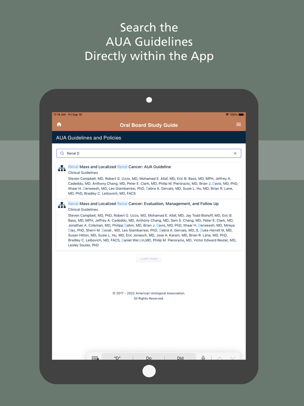 The Oral Board Study Guide App is an interactive study guide created by the AUA Office of Education with the help of 32 leading Urologists. This app is designed with the intent of helping Urology residents prepare for the Certifying (Part 2) Examination, also known as the Oral Board.