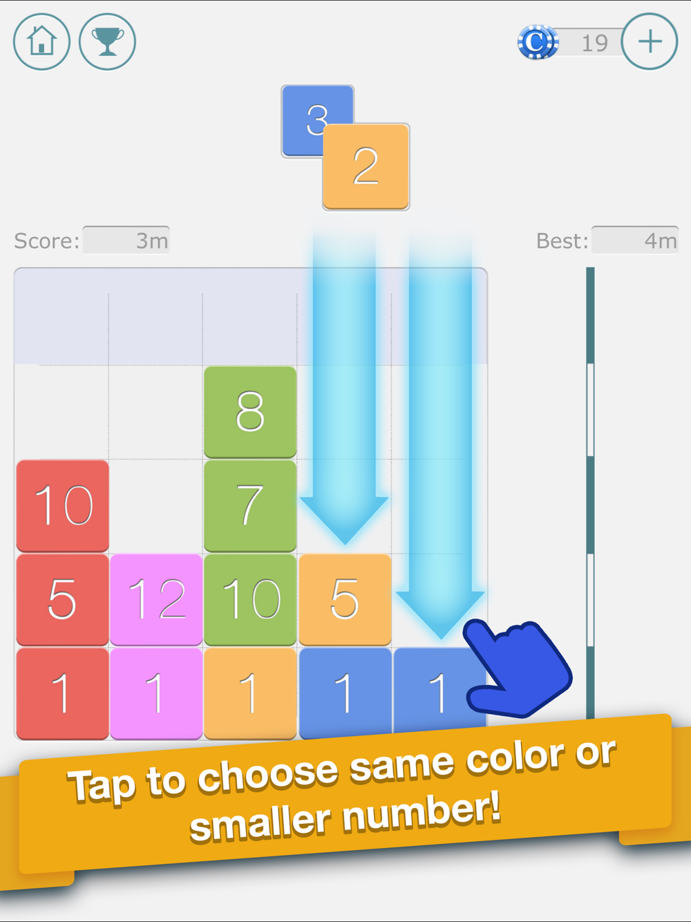 Your goal is to achieve the highest score possible by placing the numbered blocks on board. A block can be placed either on top of another block of the same color, or on top of a block with a number lower or equal to the one you have in your current block. Given numbers vary from 1 to 12 and come in 5 different colors! Row by row numbers and colors challenge you to heigher heights!