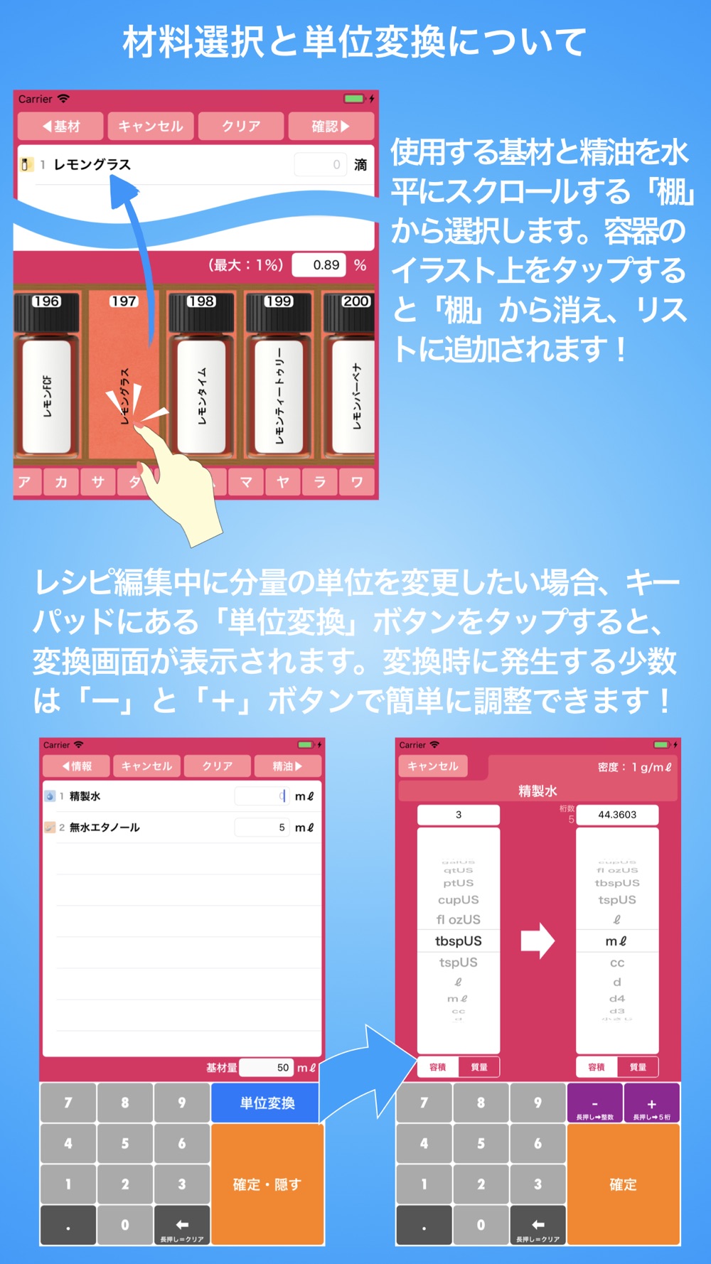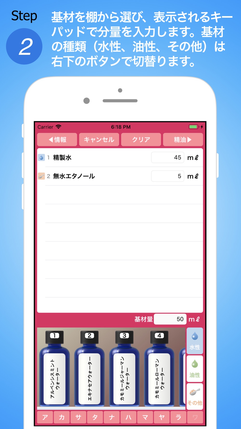 入力作業の負荷を考慮したレシピ編集画面。レシピ編集が楽しくなるワンタップ操作による基材や精油の選択と、希釈濃度の自動算出!