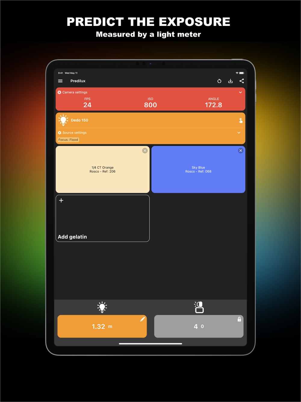 Predilux takes into account camera settings (FPS, ISO, Shutter), source settings (Focalization, Lens, Grid, etc.) and gels (Diffusion, CTO/CTB, CTS, +- Green, and dozen of effects).