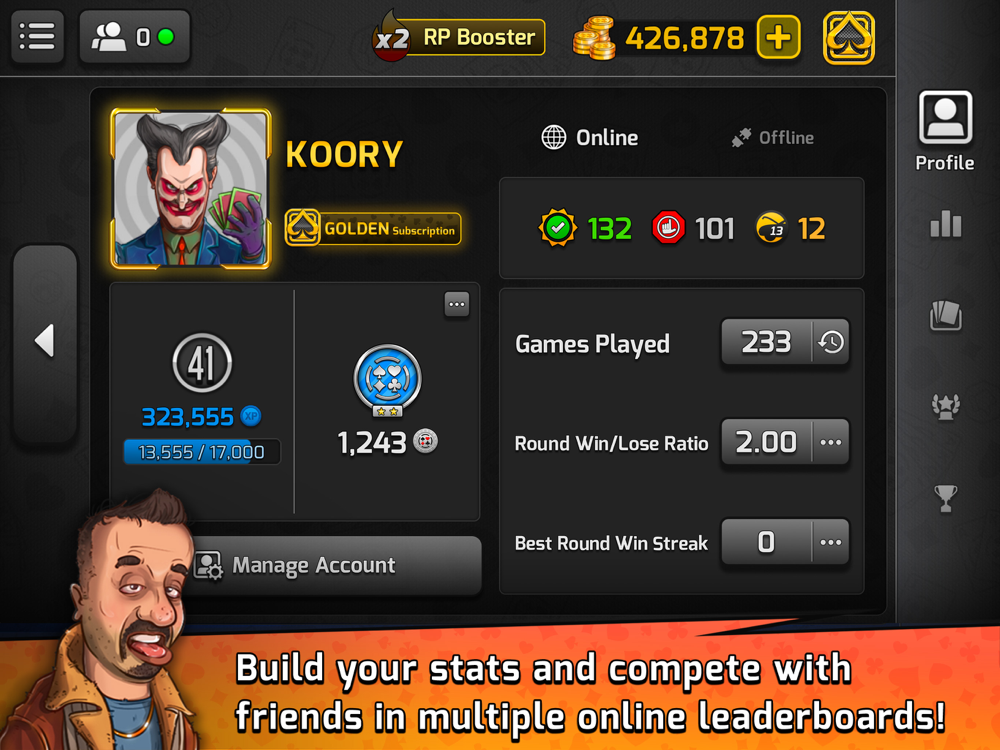 - Track your progress in Pocket Tarneeb through the Profile menu