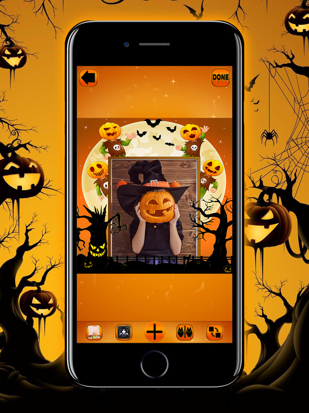 Select a Halloween picture from the gallery of your phone and use this image editor to decorate it! Take a new photo with your camera and apply a cool photo frame. Rotate, scale, zoom in, zoom out or drag the photo to fit the frame as you like. Choose from twenty happy Halloween picture frames inspired by carved pumpkins and horror movies, and try them all out. Save your new picture and share it instantly on social networks.