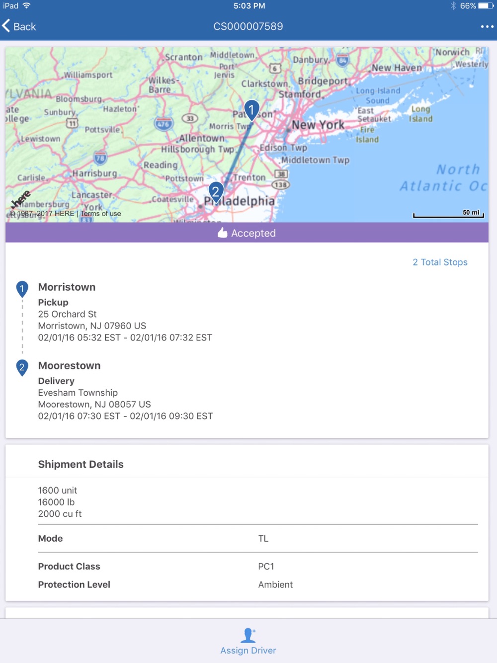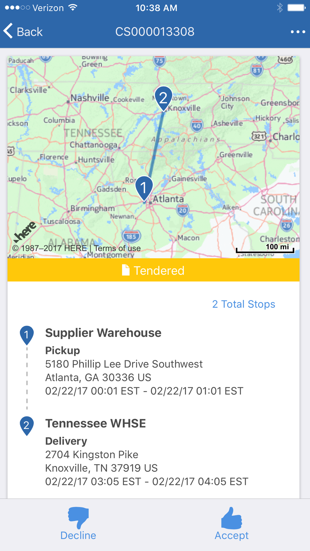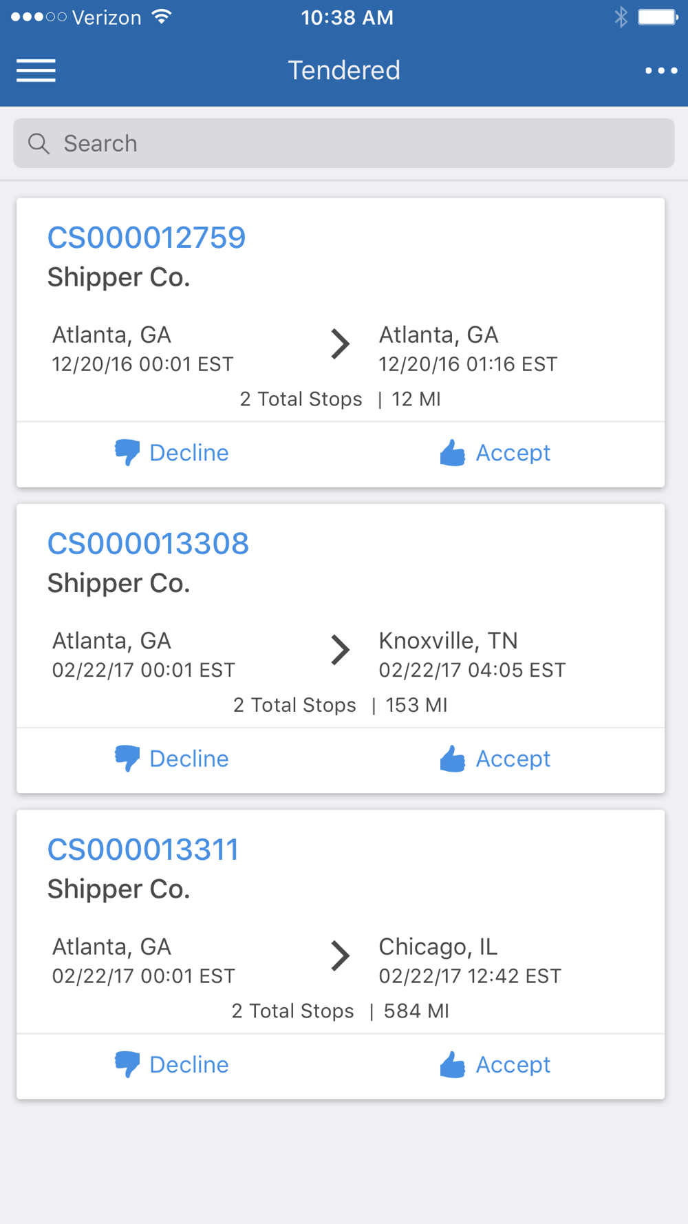 • View details about tendered shipments including number of stops, distance, hazardous status and required equipment.