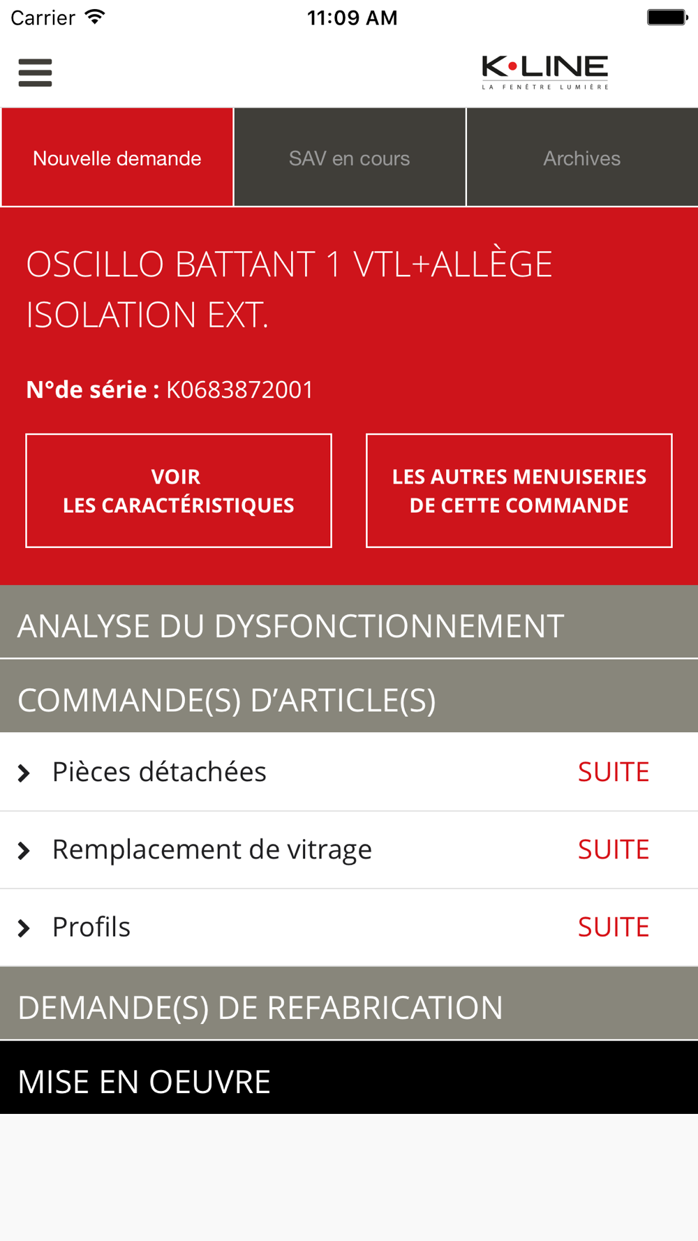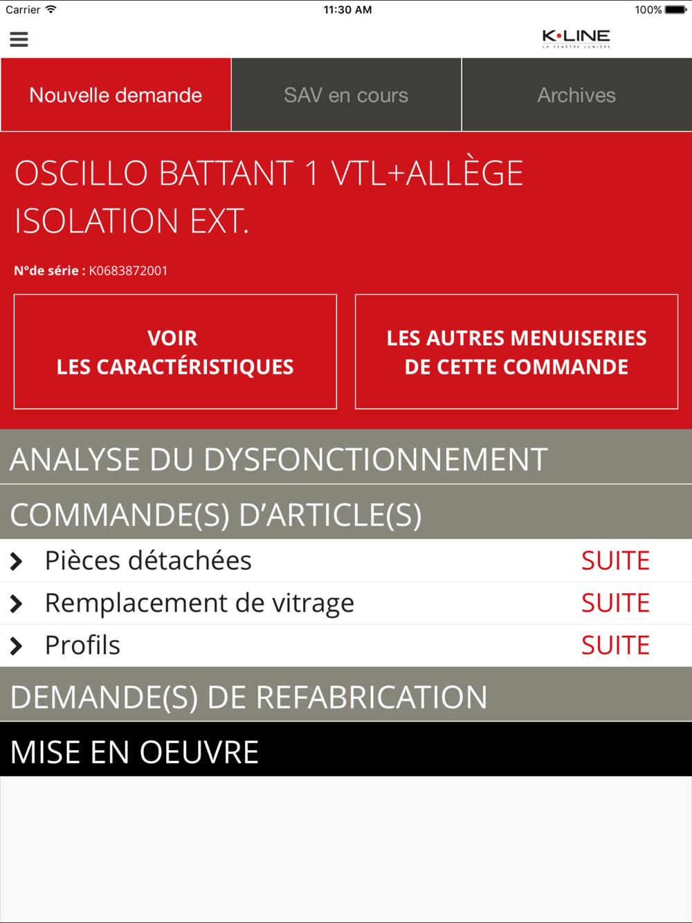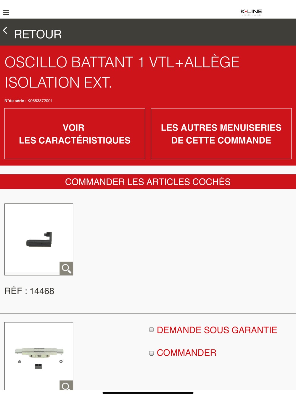 K•LINE propose une application mobile qui permet, de consulter tous les documents d’aide à la mise en œuvre, de commander des pièces détachées, des vitrages ou des profilés aluminium.