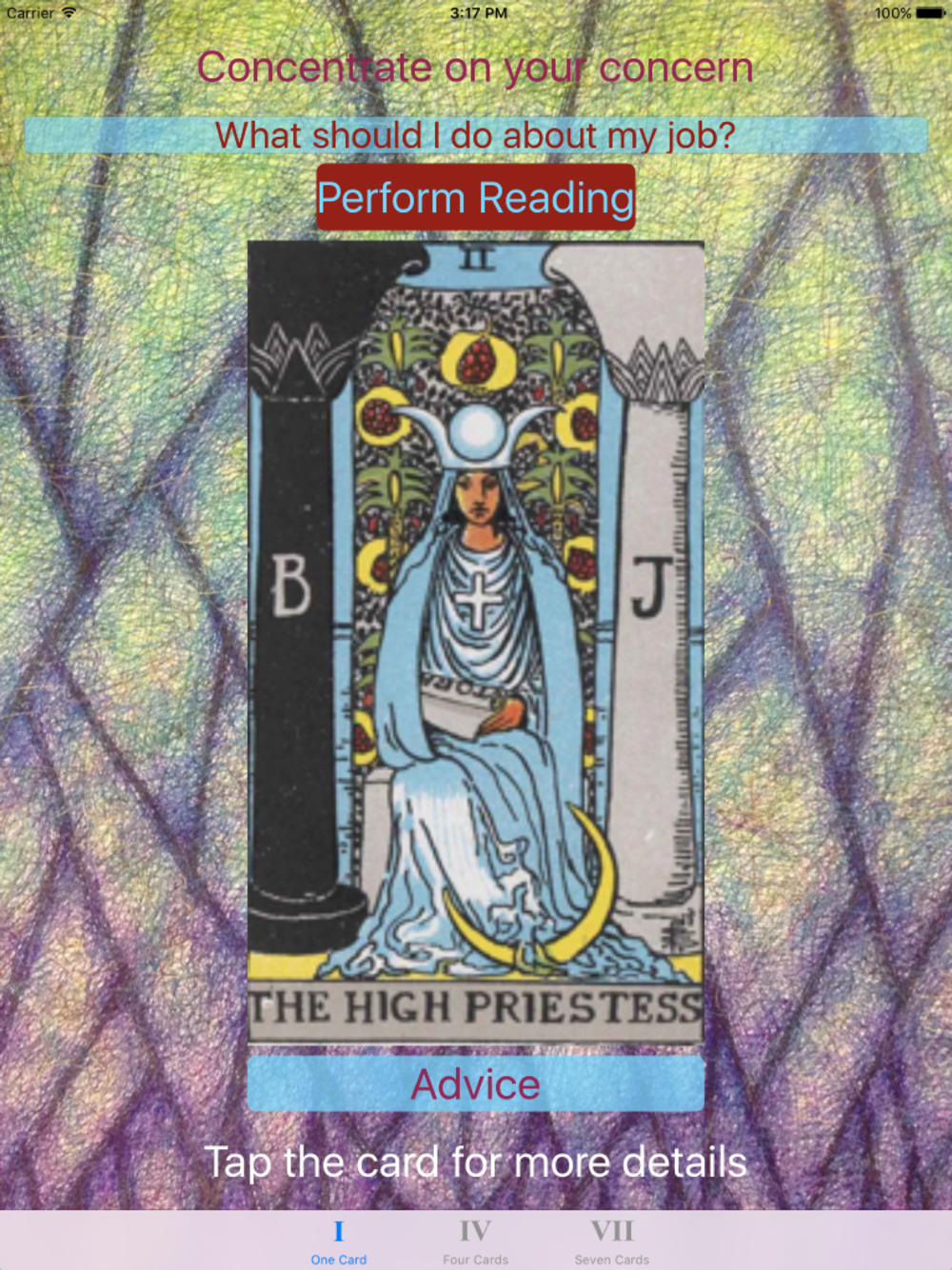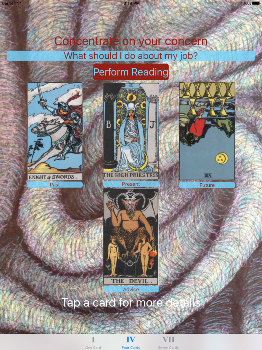 When something is on your mind and you need a guide to what the cosmos has in store for you, you can use this app for an answer. Simply concentrate on your concern, write it down to focus if you like, then press the "Perform Reading" button. A tarot card generated by the universe will be shown. Tap the card for further information.