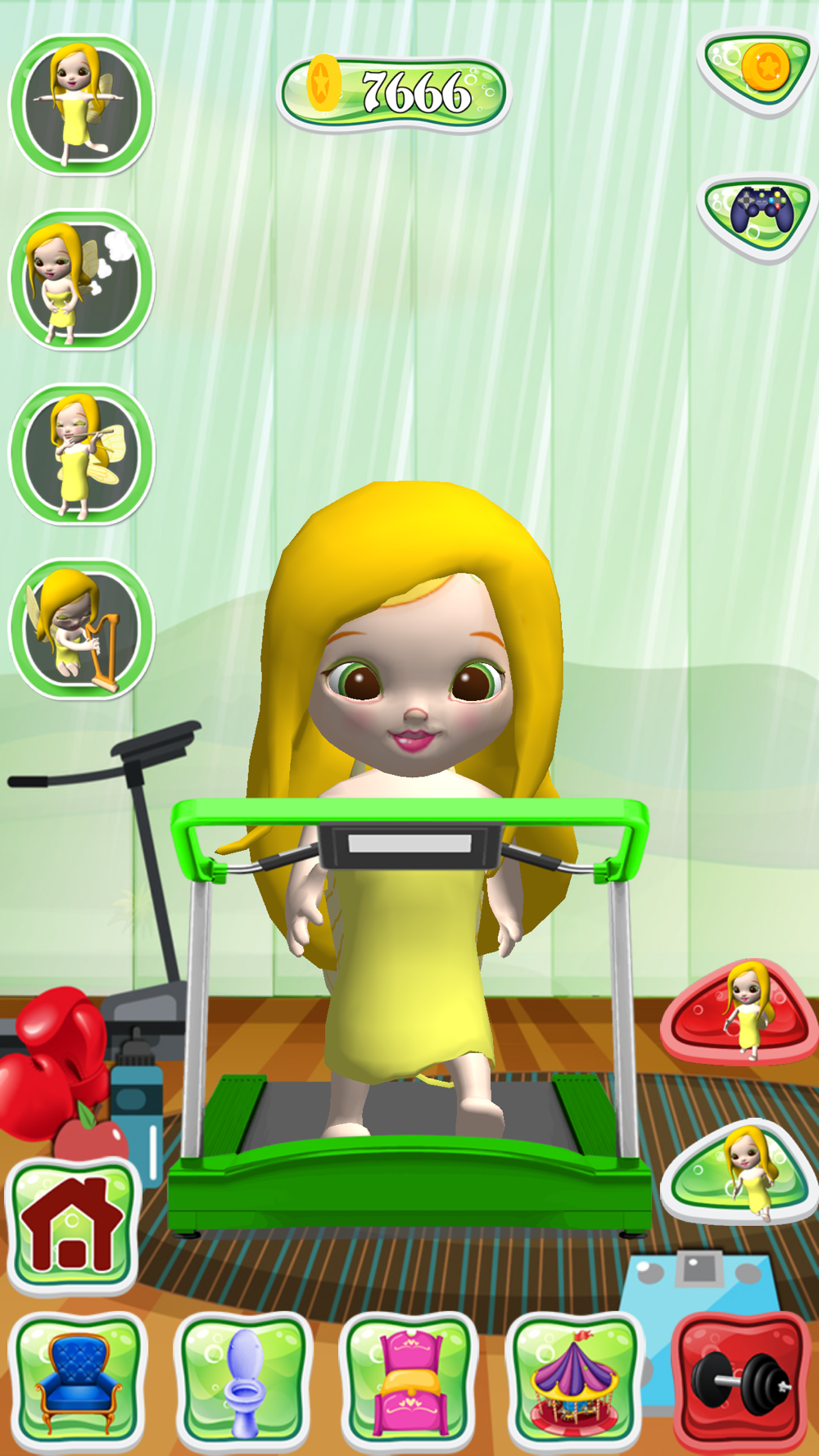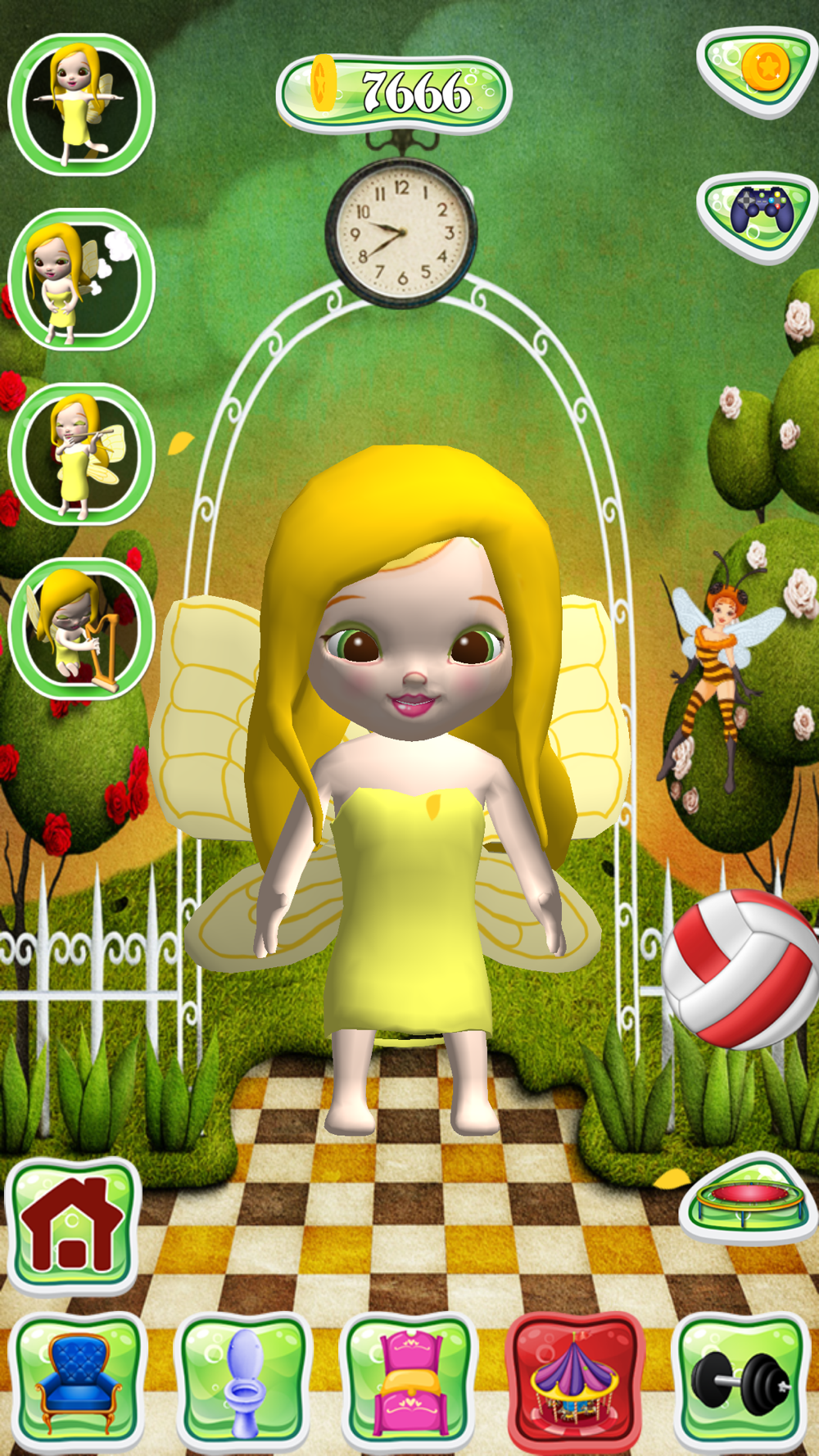 Like every other girl, this one also takes care a lot about her appearance, and that is why she is spending so much time in the bathroom. Every time before she goes to bed, she brushes her teeth, and takes a shower. And, when you turn off the light she will fall asleep immediately because she always has a very busy day. She wants to look pretty, and that is why she has equipped her home with the gym. Running on the treadmill is her favorite exercise. Being huge, her house has a gorgeous yard. There she likes to spend her free time and do the magic. Playing with the ball or hanging around with her friend, the bee, is her favorite pastime. The popular Talking Fairy app will bring so much fun not only to the children, but also to all the rest who like games and want to do something interesting on their smartphone or tablet.