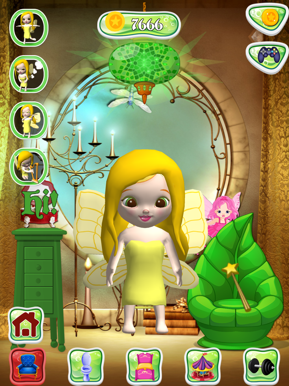 Download the newest Talking Fairy game and you will meet a being from the fairy-tales who will become your best virtual friend. You will be able to do so many interesting activities together, like jumping on the trampoline or dancing. This girl with wings loves to move in the beat of the music. She will pay a lot of attention when you are talking, and will repeat all your words in a very funny voice. Discover her hidden talents. If you become very good friend to her, she will play the flute or the harp for you. When you play the latest mini games, you collect coins for unlocking the rooms. This talking fairy has a large house and you are more than welcome to visit her any time day and night. In her living room a dragonfly and a small fairy who is spreading magic dust are keeping her company. You will also find out an embarrassing secret. She likes to fart when she is alone. This top talkative fairy has a good way of teaching your kids to count to ten. On the music box the numbers will appear and it will not take long until your children start counting.