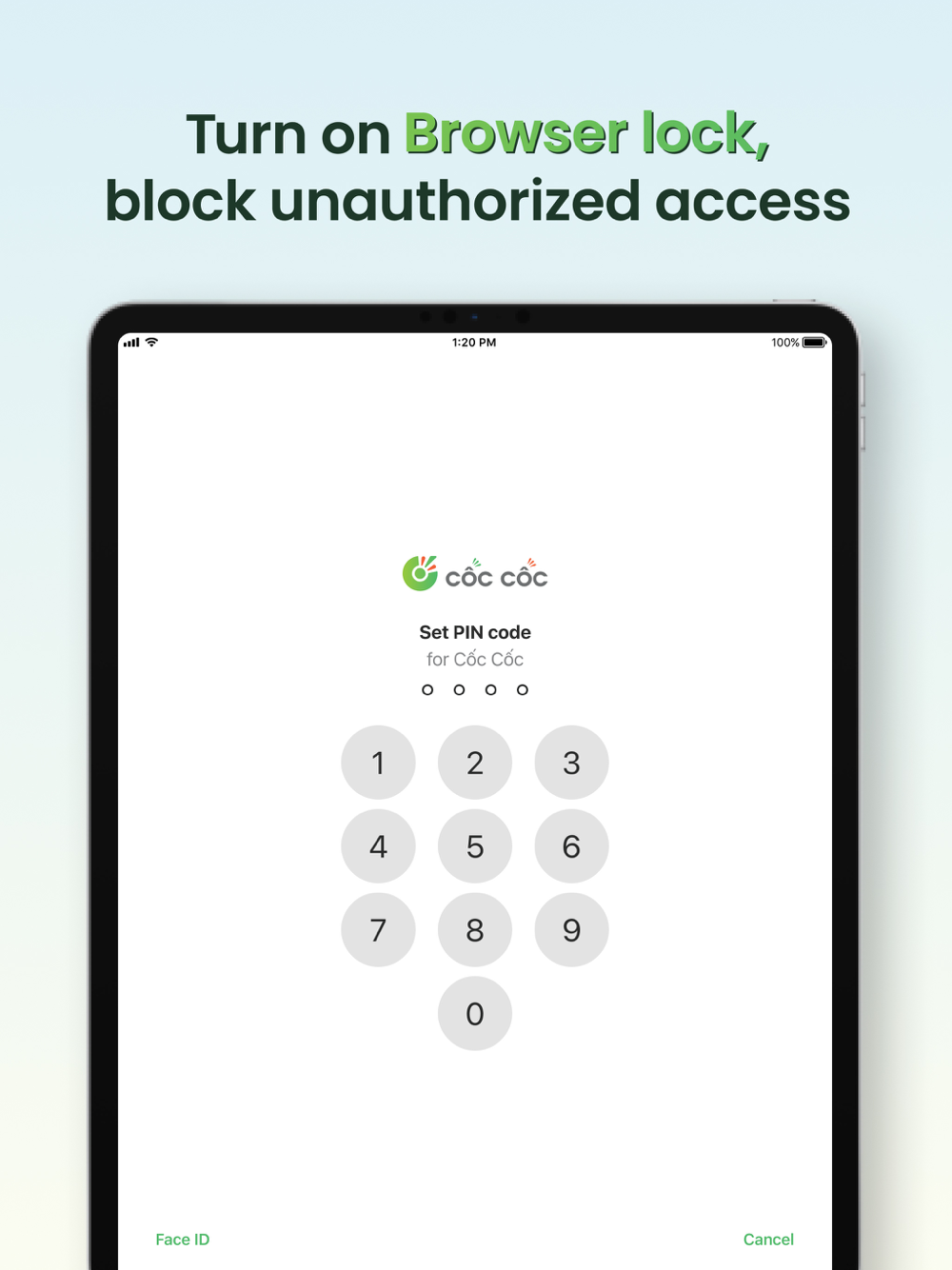 - Browser Lock: Lock Cốc Cốc app with PIN code, Touch ID, or Face ID.