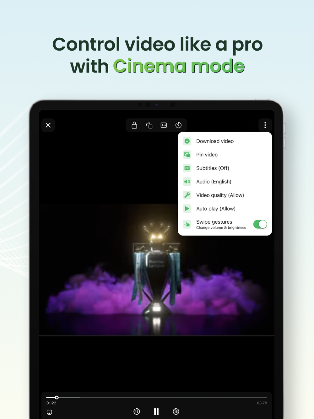 - Cinema Mode: Watch video in fullscreen mode and personalize your experience with advanced settings such as adjusting volume, brightness and seeking in video using touch gestures; disabling touch gestures; selecting play speed, screen ratio, subtitles and setting sleep timer.