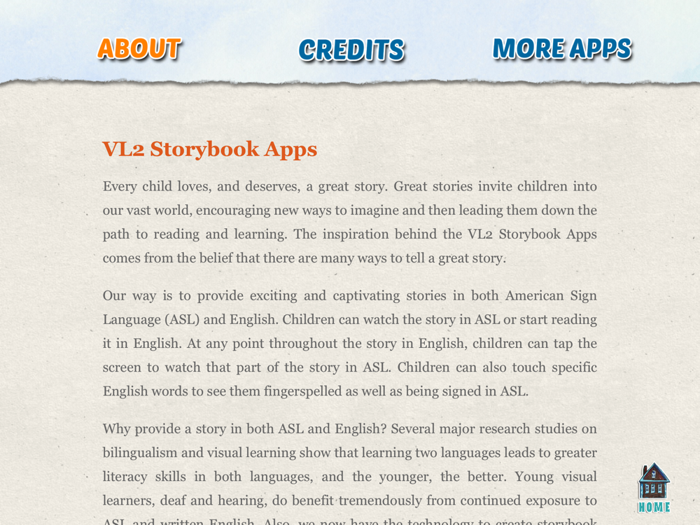 • Interactive and bilingual ASL/English storybook app designed for visual learners, especially deaf children between the ages of 3 and 7, and their families.