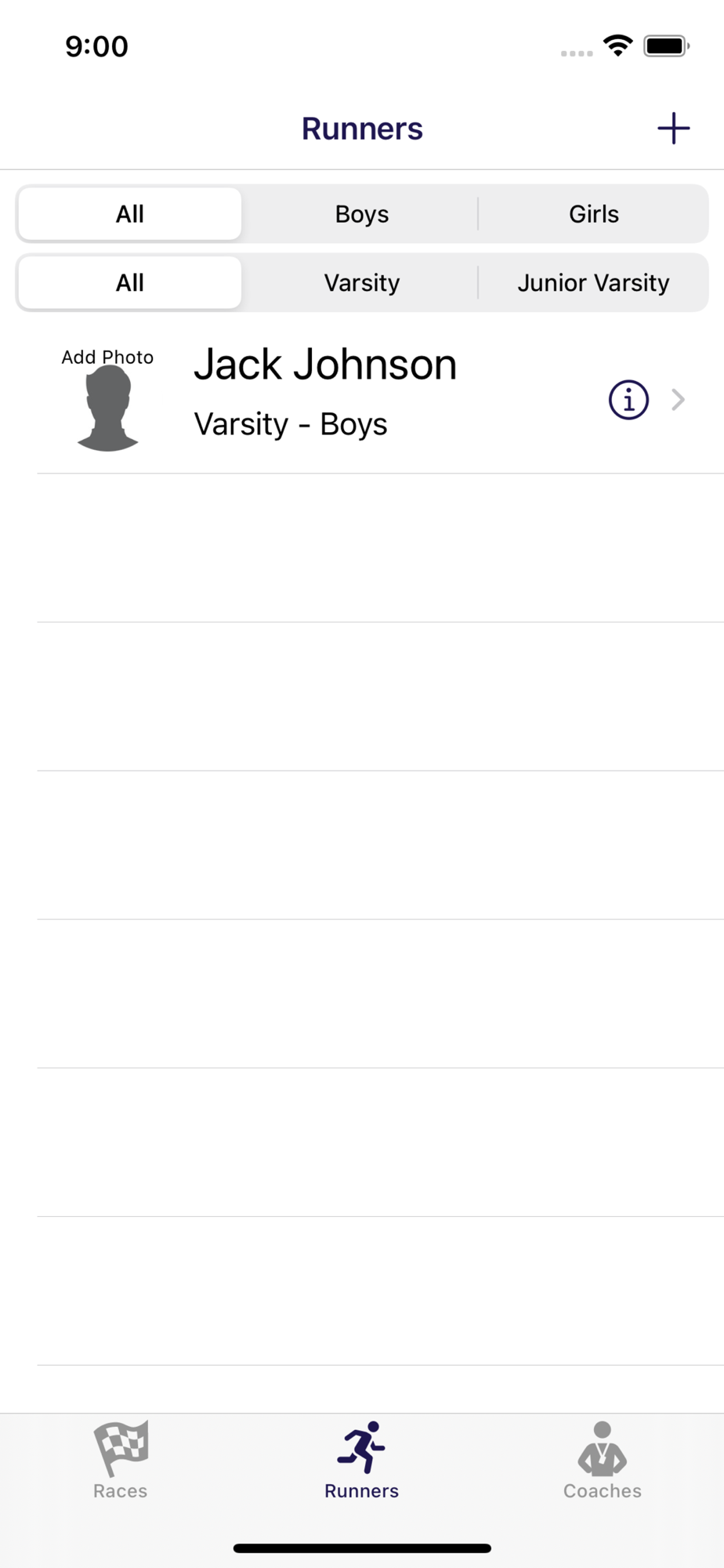 Race Management - Create races with a name, distance, and group (Varsity - Boys, for example), then rearrange runners according to their expected finish time and delete those who are absent. From there, log each of their race times simultaneously, with the option of logging up to 4 laps. View the results and email them. Navigate back to the Races View to see results from past races.