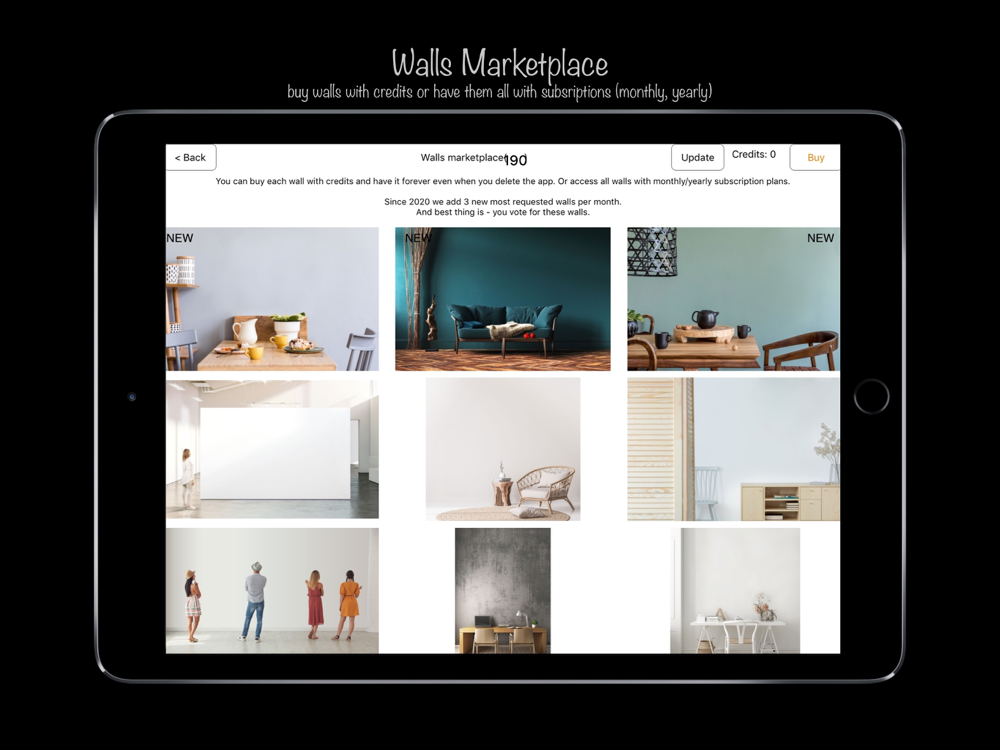 Whole app is free with all functions and 12 default stylish interiors for small, round and big formats. Only thing you need to pay is need for more walls. You can decide if you buy credits and then select which walls do you download and have them for lifetime. Or you can pay monthly/yearly subscription and you will have access to all walls till you pay it.