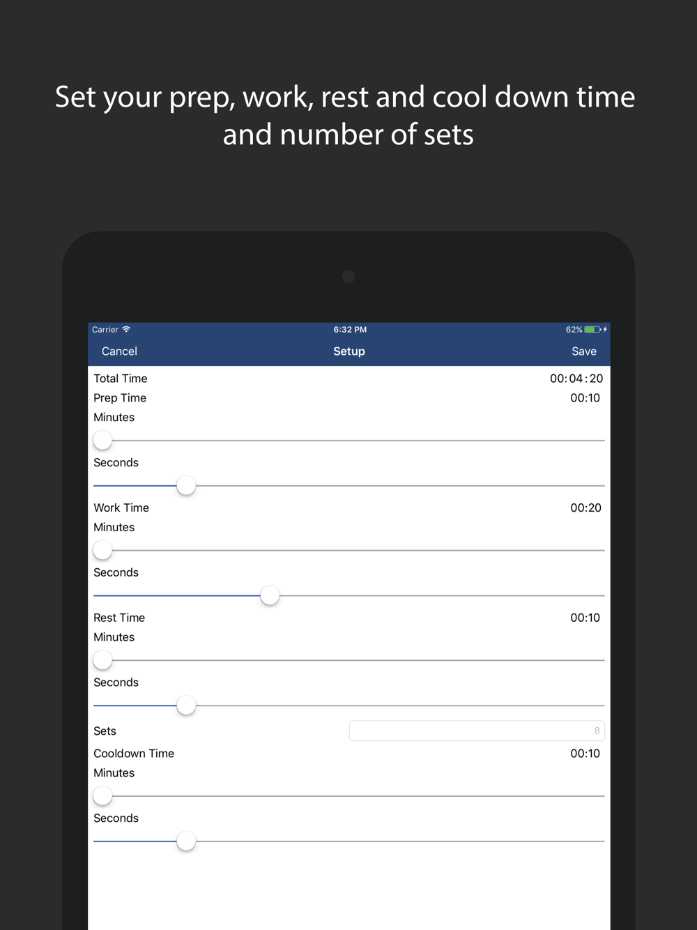 Perfect for high intensity interval training (HIIT), this timer allows you to set preparation, work, rest and cool down times, as well as the number of sets.