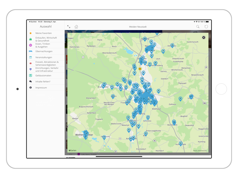 In the near future Region Weiden will show you the way to the nearest playground, public toilet, ATMs, Wi-Fi hotspot, kindergartens, hospital, power station and much more. There are also shopping tips with current bargains, promotions of bistros, pubs and restaurants.