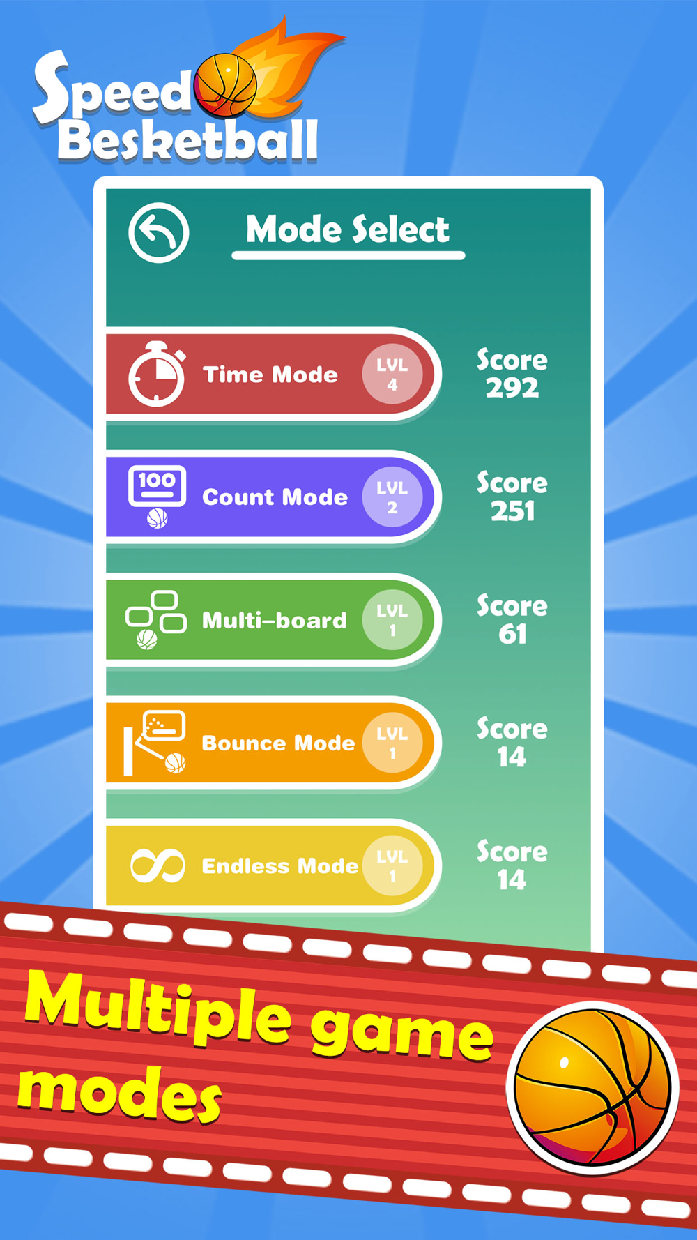 5. There are five game modes: Time, 100 Balls, Multi Hoops, Bounce and Endless. You can choose different modes to experience the different fun!