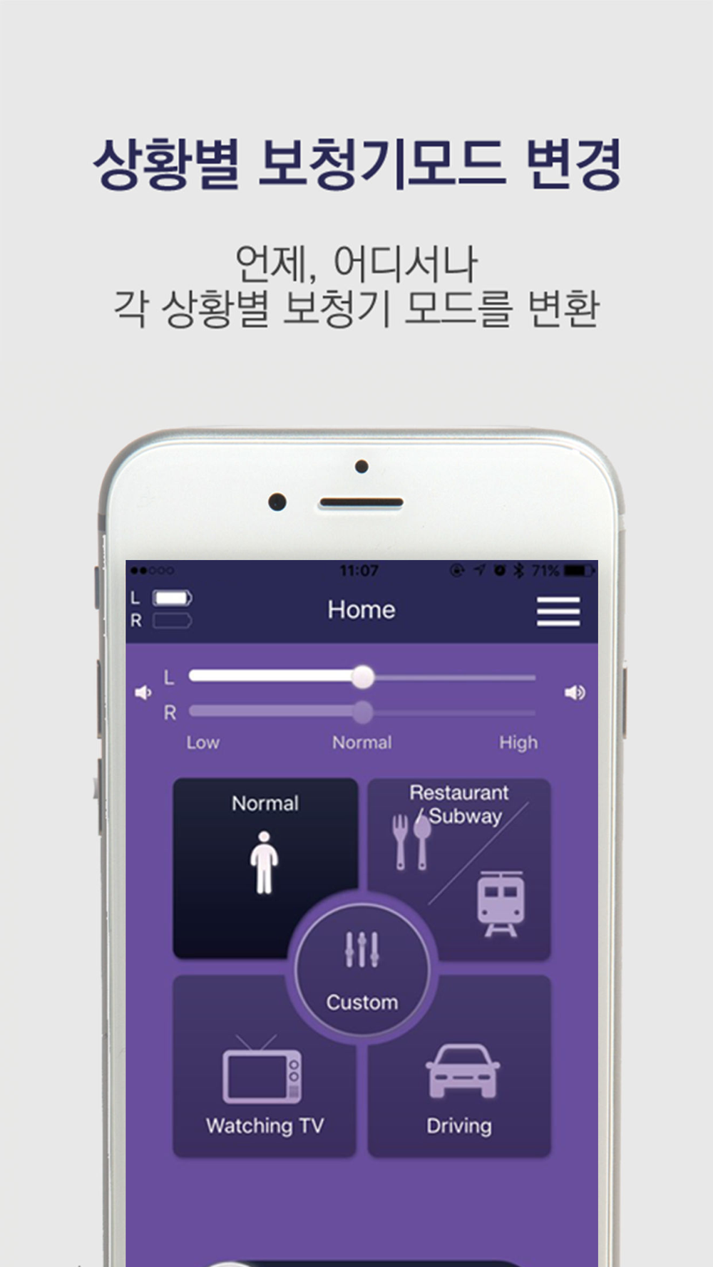 - 주위 환경별 모드 설정 및 변경 (일반, 레스토랑/지하철, TV시청 및 운전)