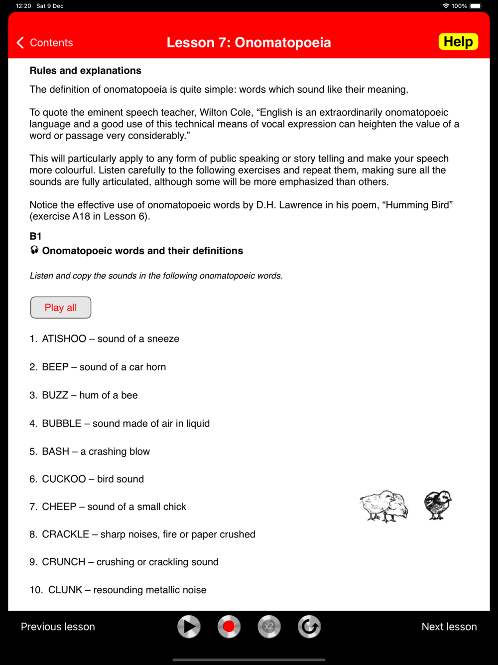 In the second part (Lessons 7-17), you practice muscular and rhythmic exercises, English sounds in comparison charts, onomatopoeia and place names. These are classic elocution lessons, which help to make your speech clear and crisp.