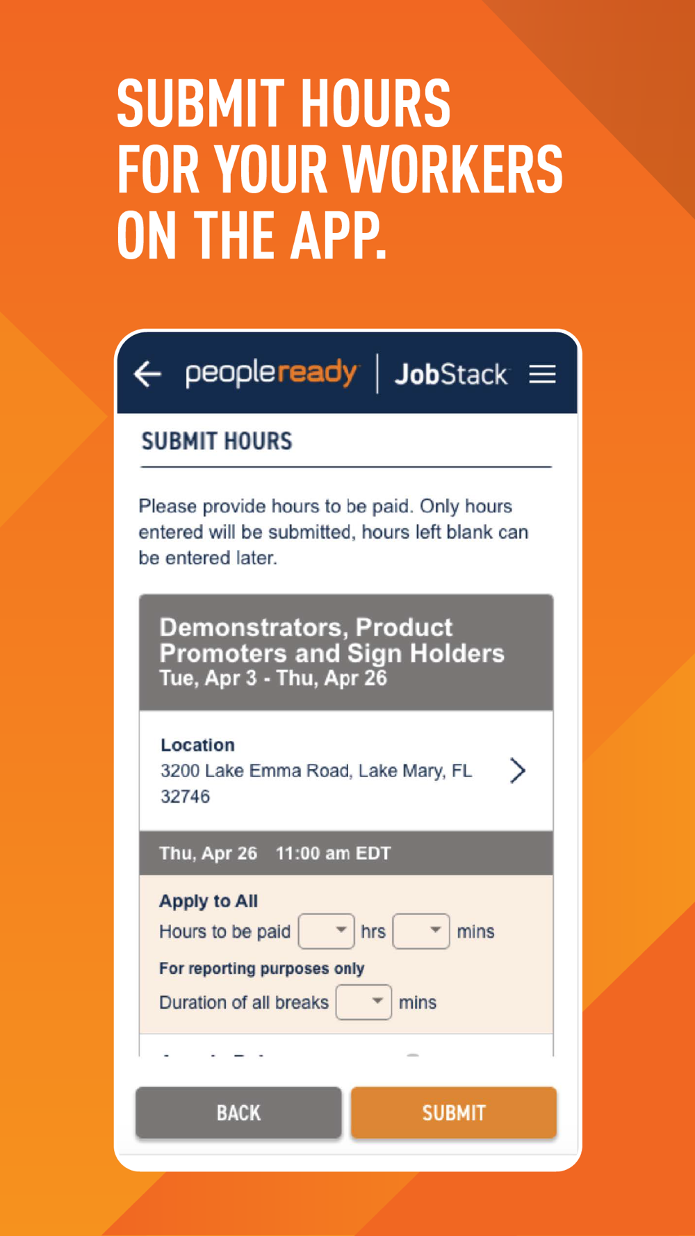 • Submit hours for your workers after they complete a shift from within the app