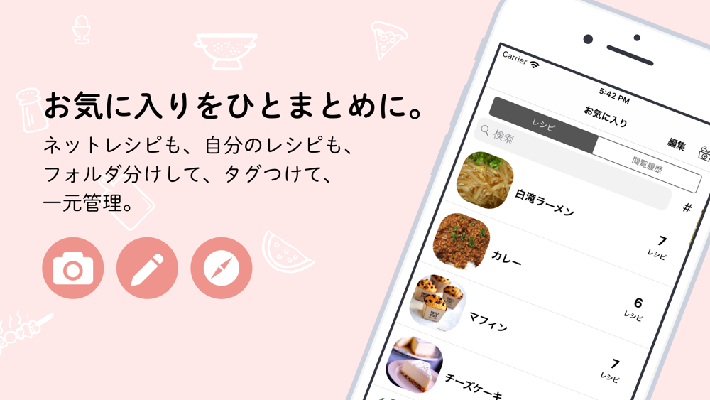 お気に入りレシピの検索も可能。タイトルやメモにいれたテキストを検索することができます。ハッシュタグにも対応しています。さらに、同じiCloud IDでログインしているIOS端末間でお気に入りの共有ができます。お気に入りはCSVでエクスポートも可能です。