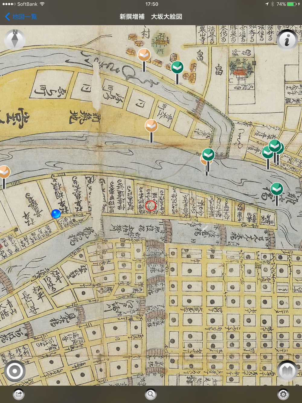* 古地図とGPS情報を対応づけており、古地図上に現在地を表示します。