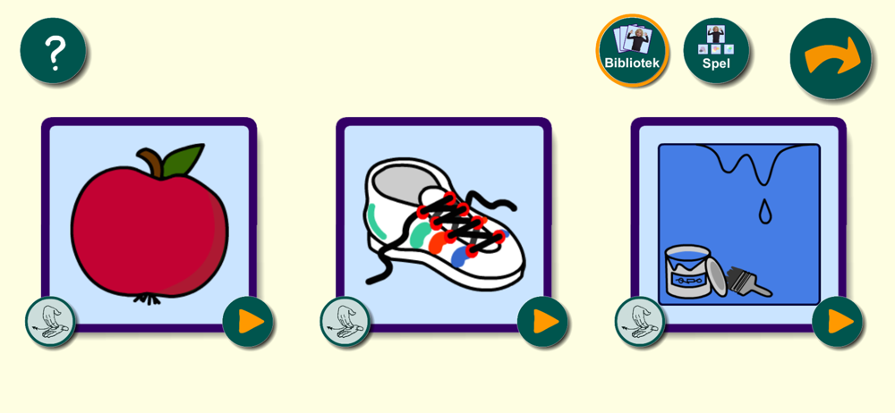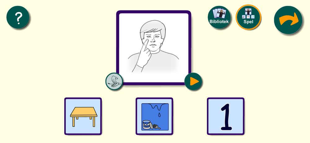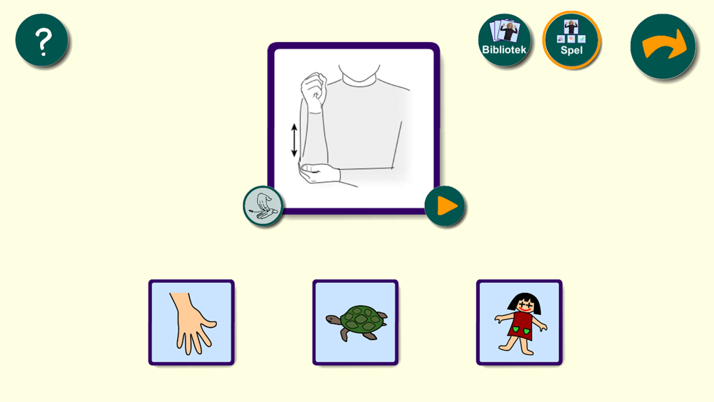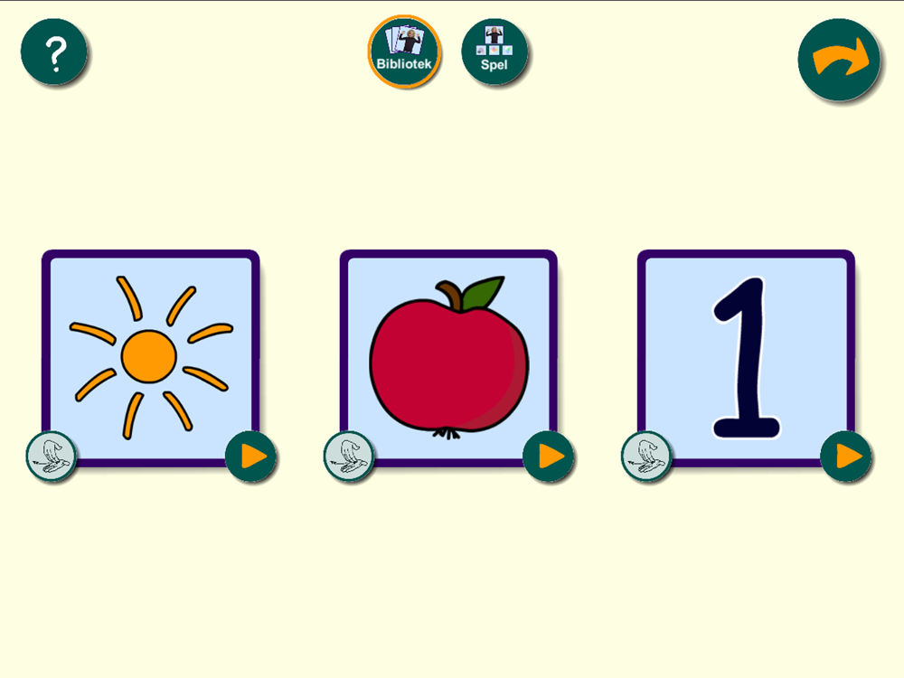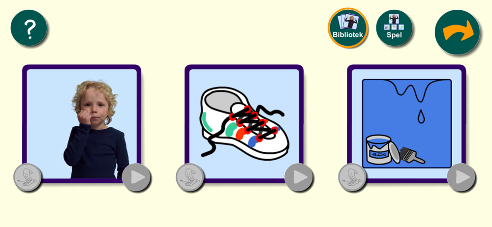 I biblioteket får du utforska teckenspråket genom att välja mellan tre ord. Det är tre kort med ritade bilder som föreställer orden i en viss kategori. En film spelas upp med ett barn som tecknar. Ordet sägs högt som en hjälp till hörande.