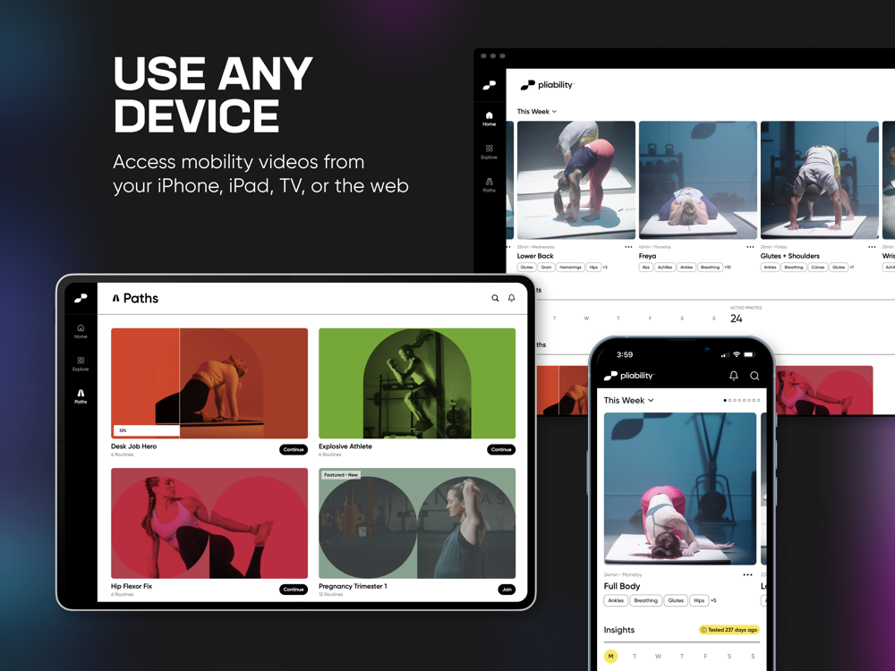 pliability works on every screen and every device. It’s easy to do anywhere - even if you are traveling or offline. You don’t need any equipment for most of our routines, just a place to stretch. Plus, our videos are conveniently downloadable.