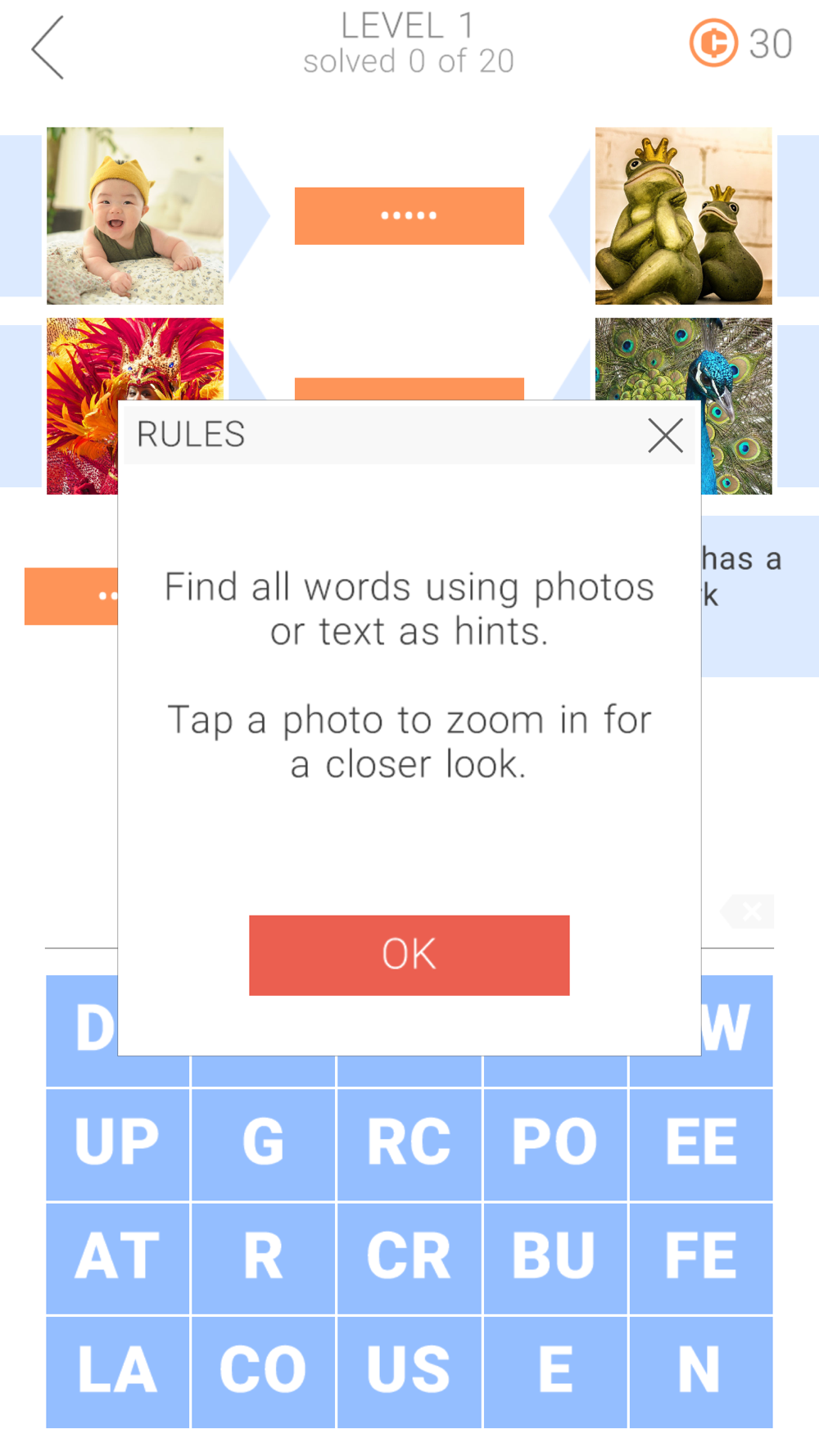 Each level contains 20 scrambled words with photos and word definitions. Try to find these words and solve all levels! You can tap the picture to zoom in for a closer look. Some answers are straightforward, some are quite tricky. Enjoy this addictive new brainteaser!
