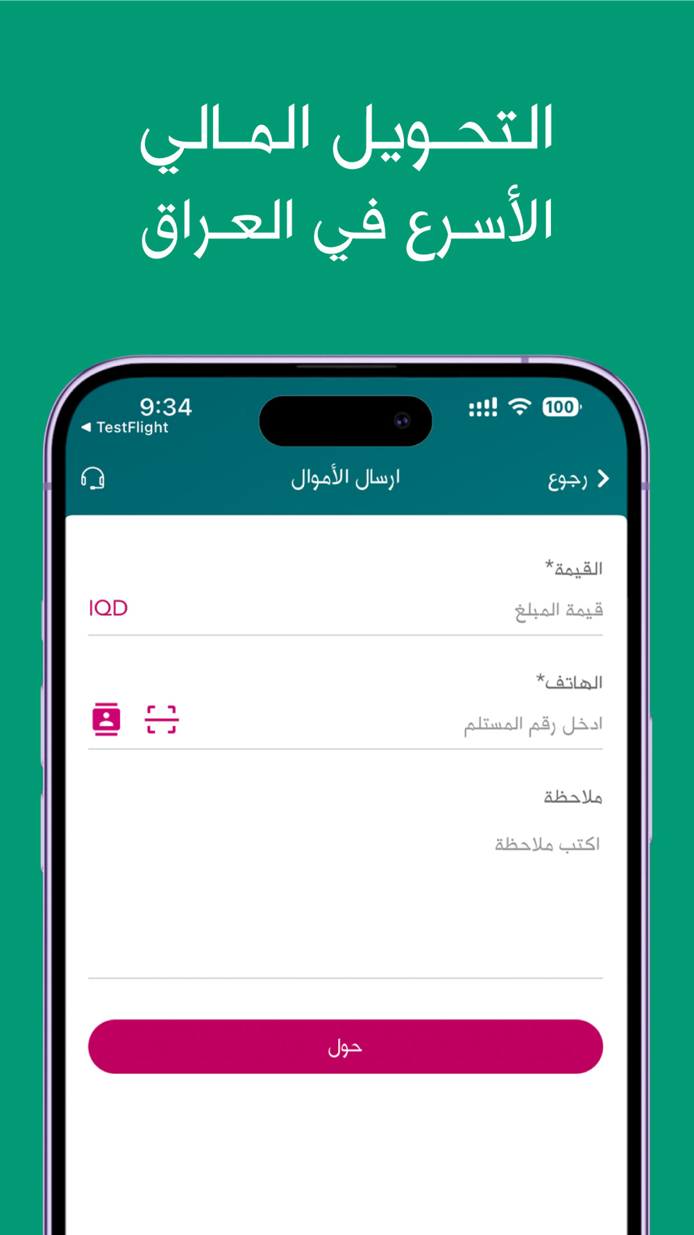 ارسل واستلم دفعات اموال من الزبائن او الاصدقاء. كما يمكنك ترك ملاحظة مع كل تحويل وممكن تتضمن رموز تعبيرية (emojis)