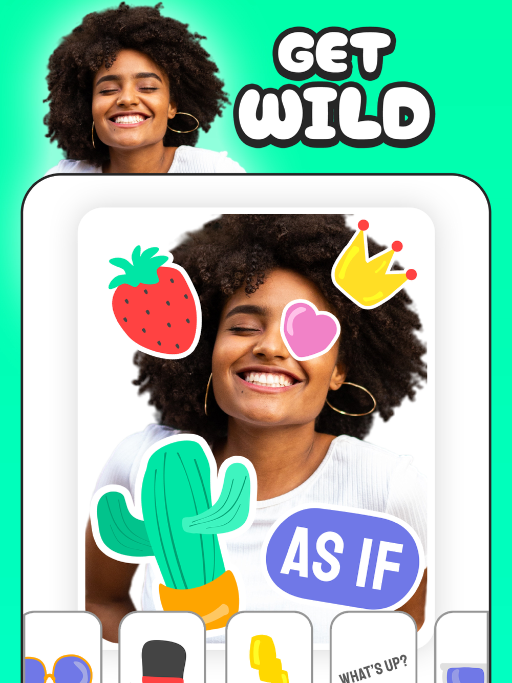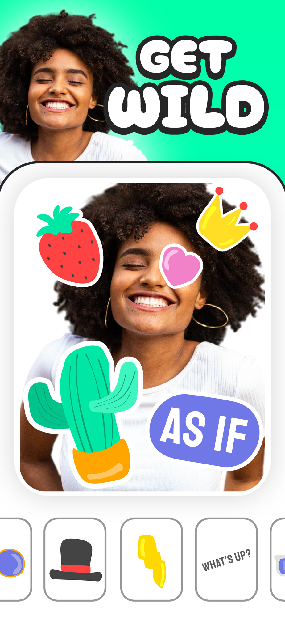 Choose from a plethora of free stickers to spice up your photo. Add some quirky fun with word bubbles, beards, glasses, hats, and many more, all created uniquely for the What Will I Look Like app.