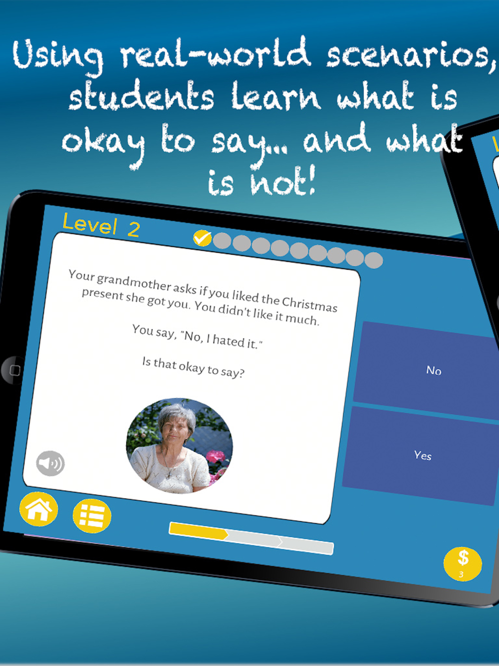 The “Say It… Or Not?” app gives your child the social filtering skills they need to better manage social situations at home, school and in the community.