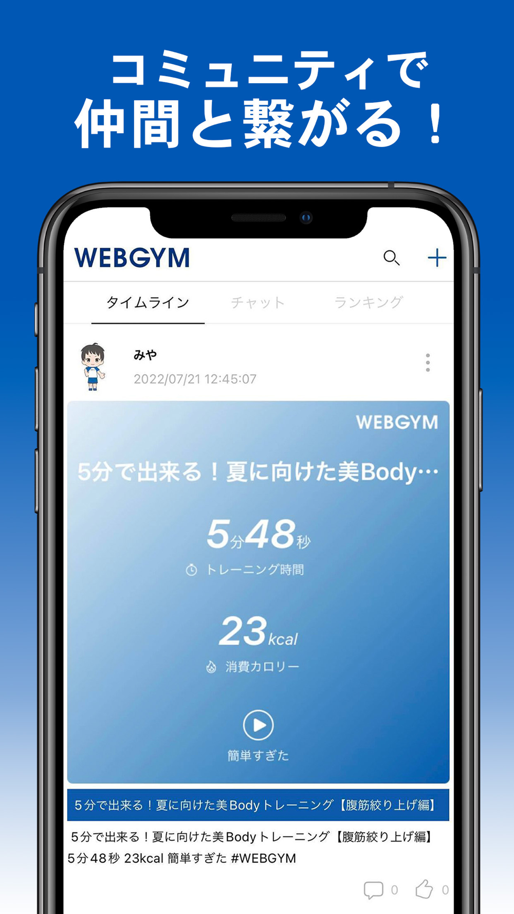 全WEBGYMユーザーの投稿を見ることができます。周りの人の投稿がモチベーションを高めてくれます。ハッシュタグ(#)をつけて投稿することによって、自分の興味のある「コミュニティ」に参加することができます。同じ興味を持った仲間と交流し、フィットネスライフをより楽しみましょう!