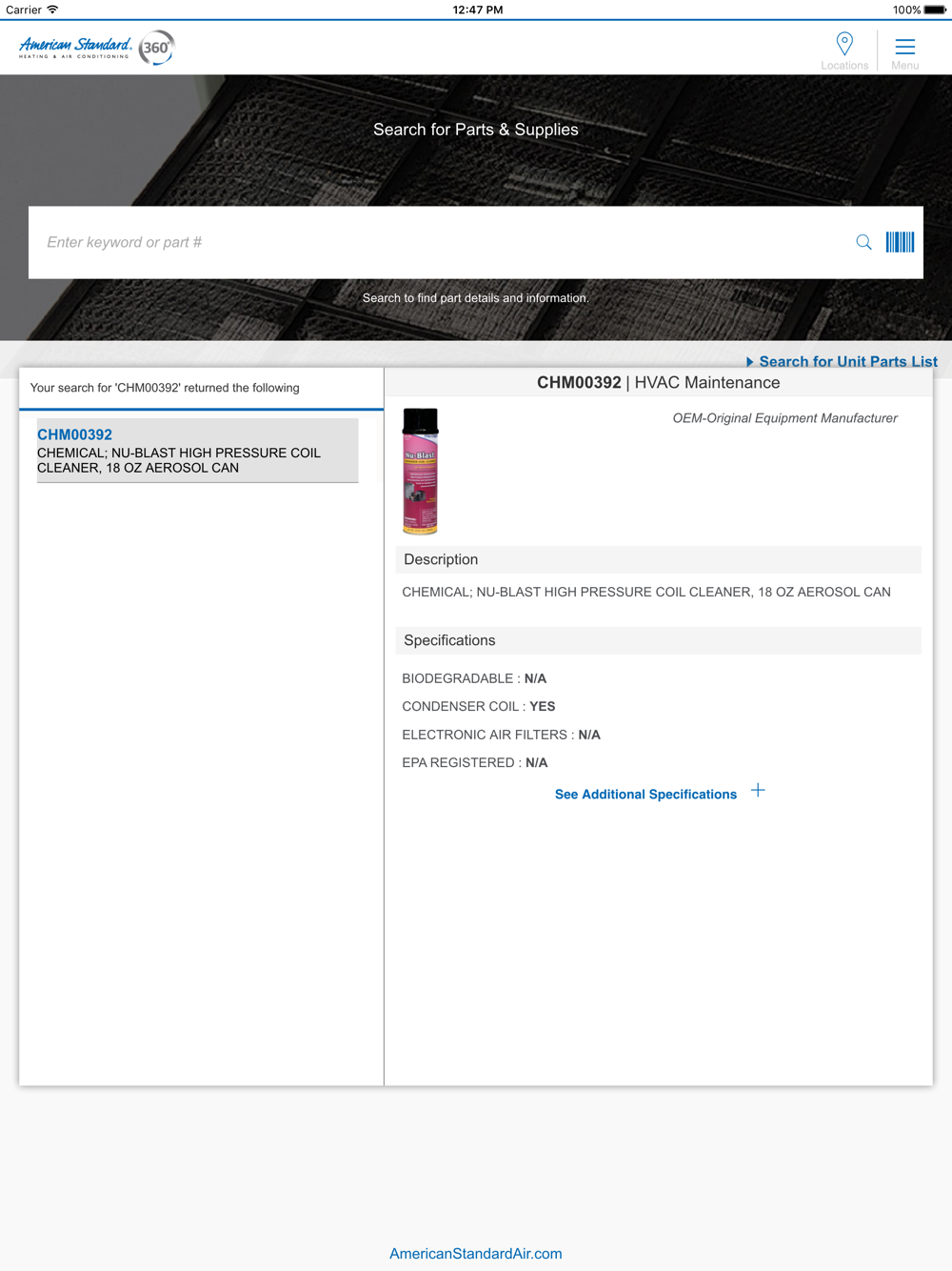 Enjoy the convenience of using American Standard Air 360° on your phone or tablet to look up details or research information, whenever and wherever you do business. American Standard Air 360° can be used by contractors, office administration and sales support to maximize efficiency and productivity. Consider the American Standard Air 360° app your toolbox for easy access to equipment and part information.