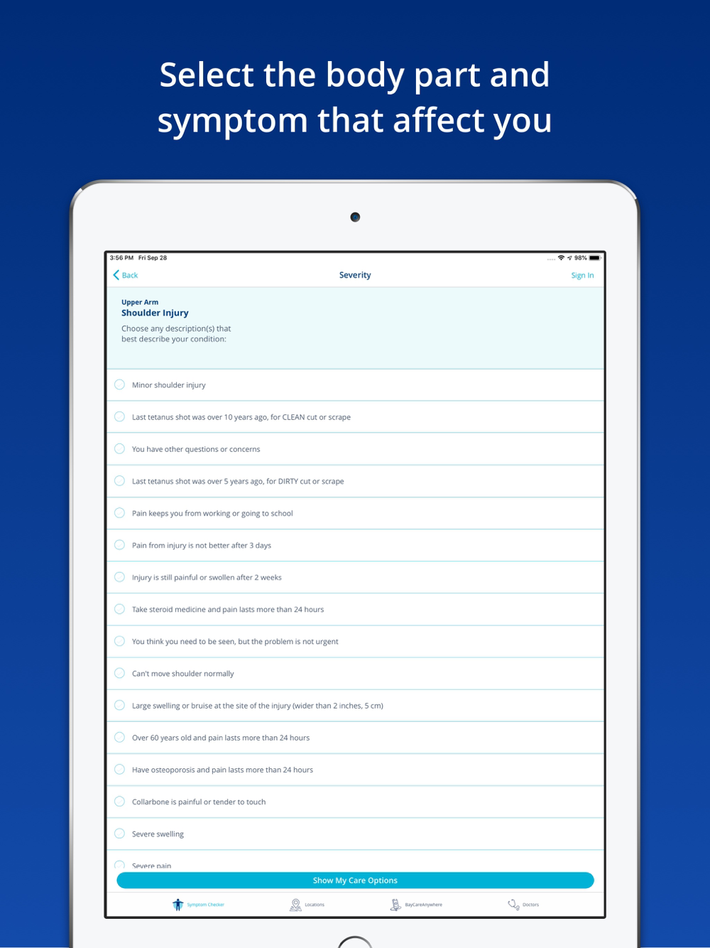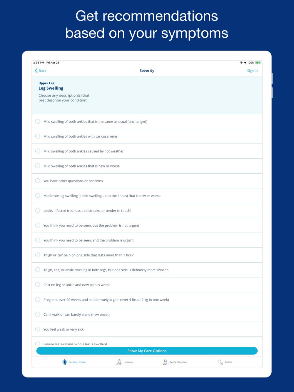 Symptom Checker: Identify ailments and associated symptoms to see the recommended level of care you need