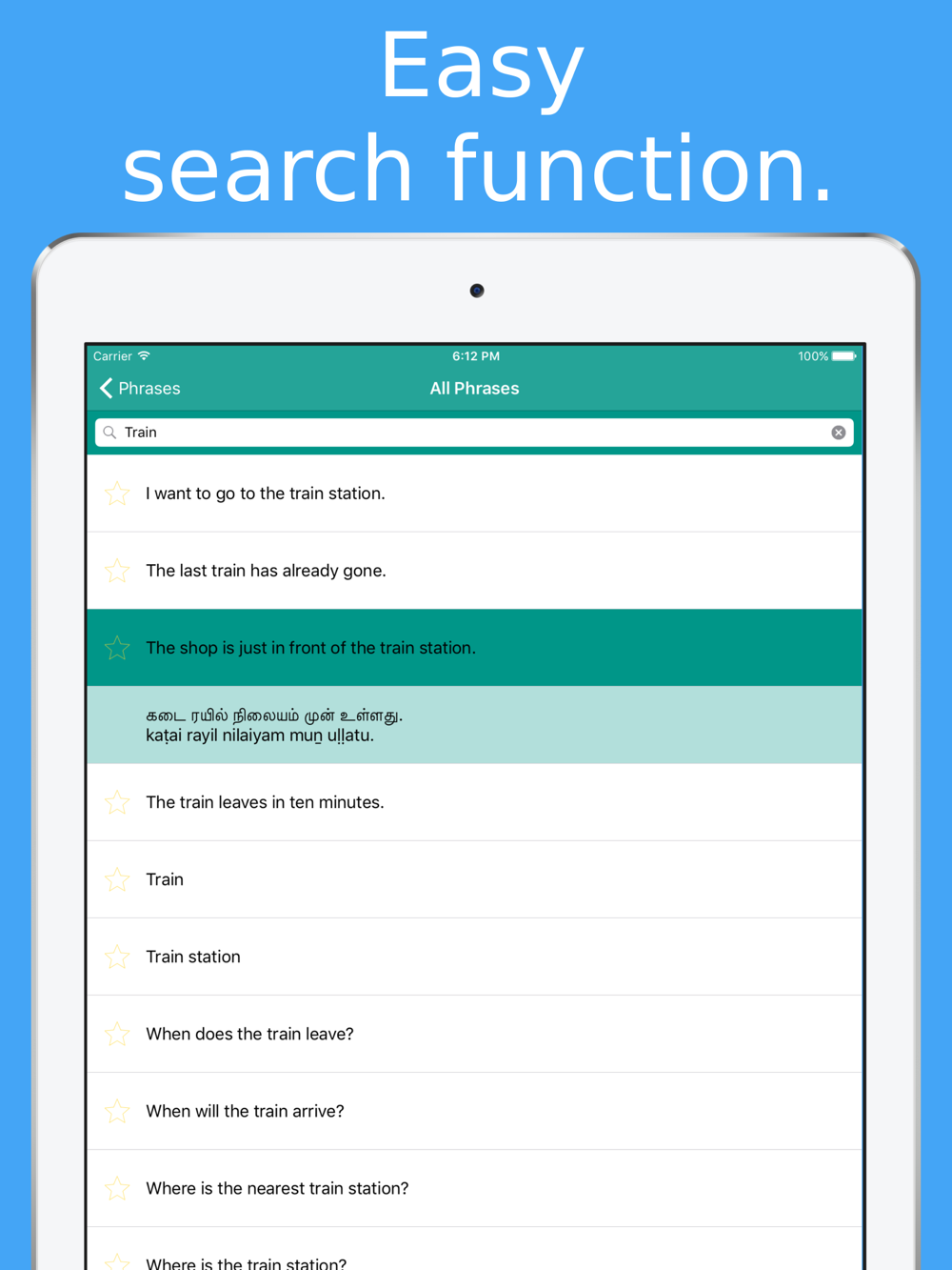 All Tamil phrases and words are presented to you in both phonetic and original Tamil writing. They are recorded by a native speaker from Sri Lanka.