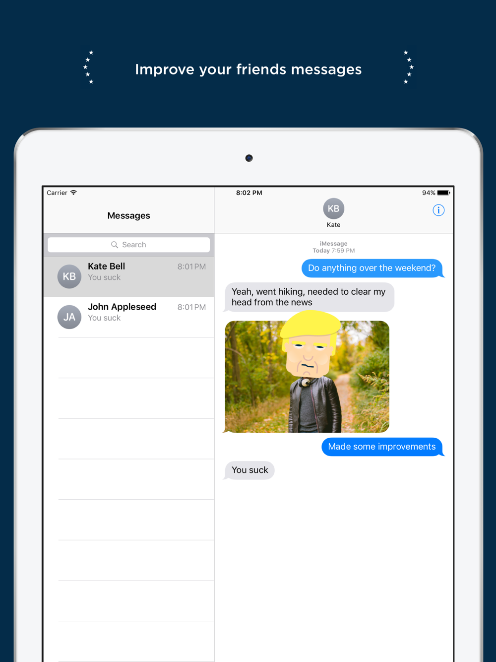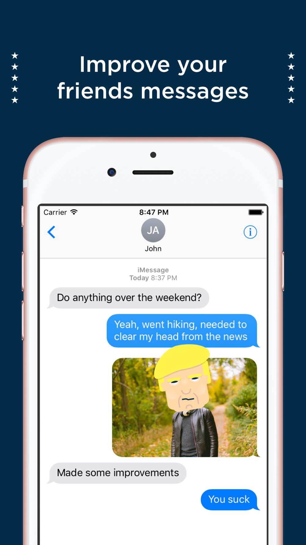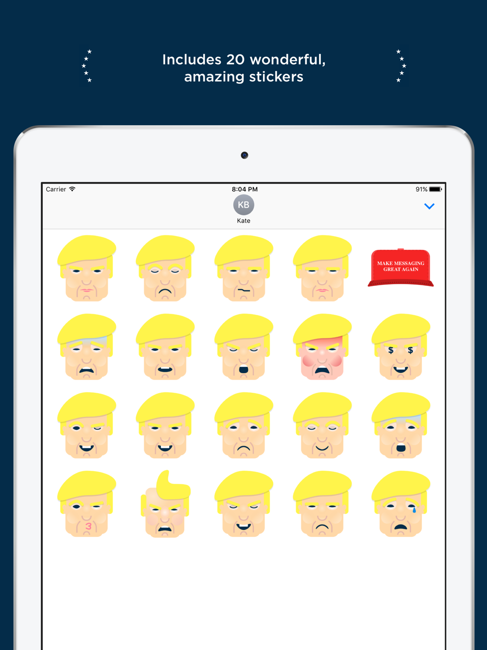 Text with the temperament of a president and Make Messaging Great Again! Make your message known with 20 terrific, wonderful, beautiful stickers.