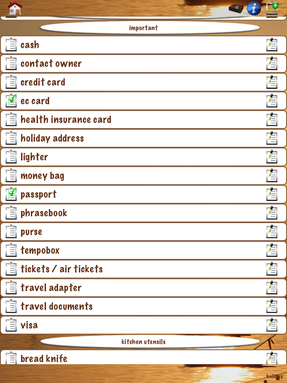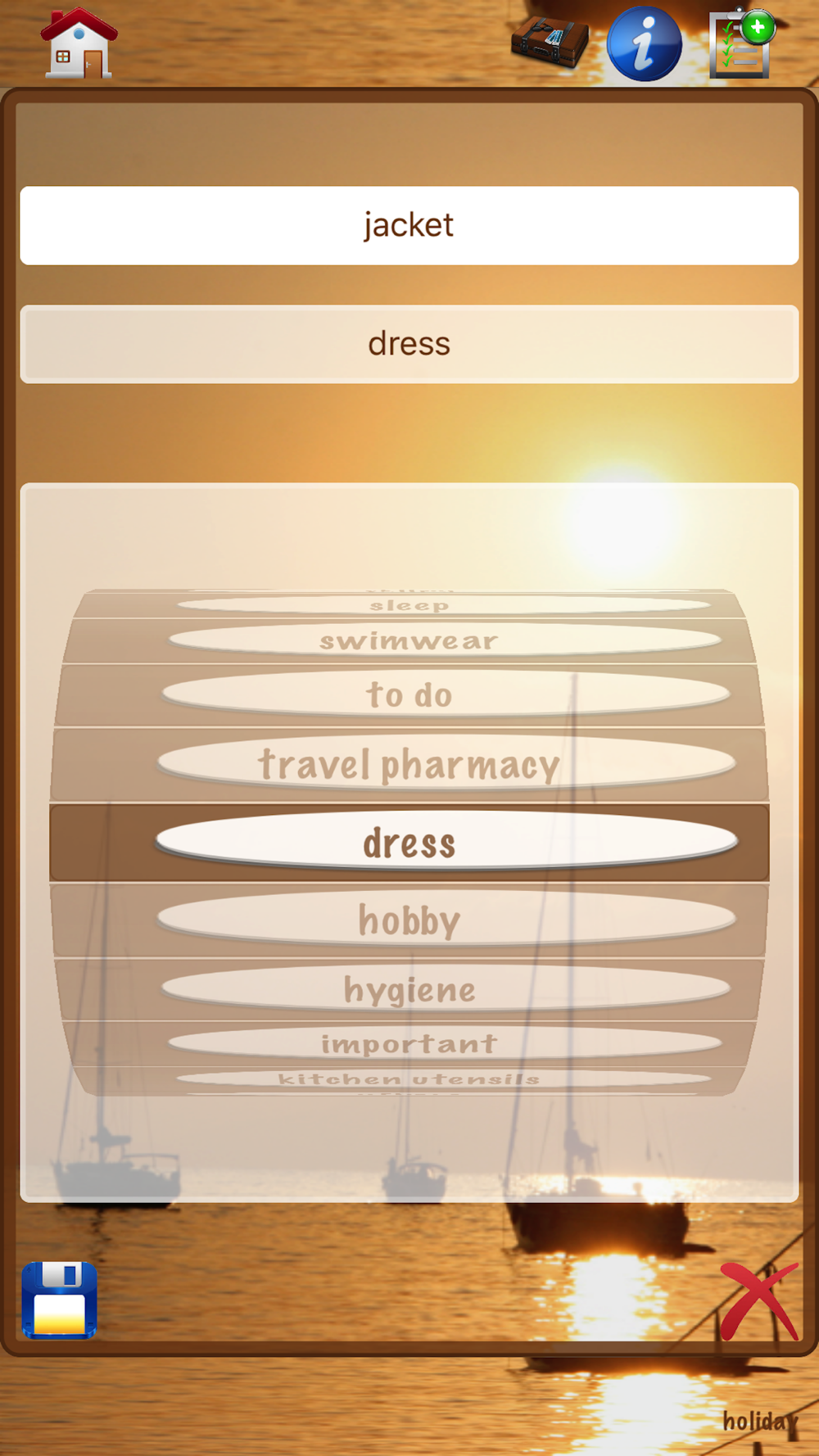 Create different pack lists, e.g. Skiing holiday, sailing holiday or vacation in the apartment. Each list is customizable.