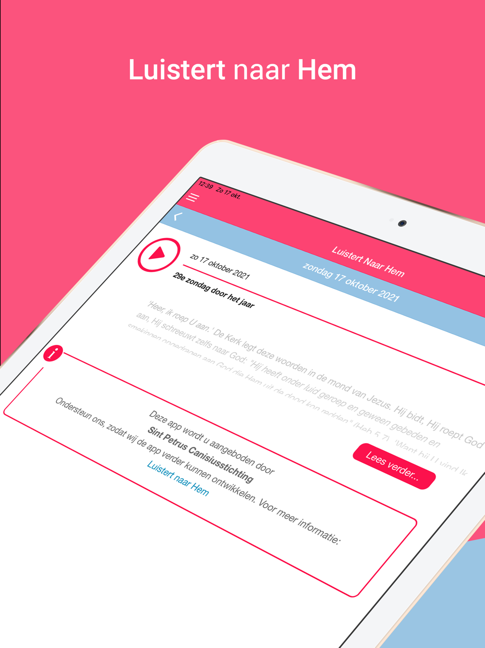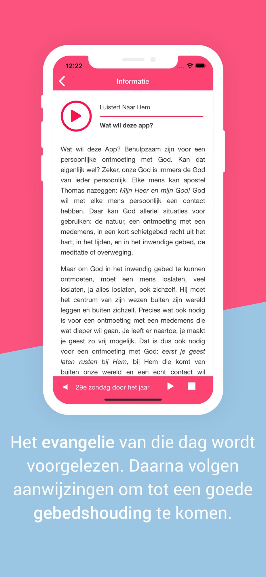 Behulpzaam zijn voor een persoonlijke ontmoeting met God. Dat gebeurt aan de hand van het Woord dat God nu spreekt tot zijn volk in de eucharistie van de dag. Het evangelie van die dag wordt voorgelezen. Daarna volgen aanwijzingen om tot een goede gebedshouding te komen. Vervolgens wordt het Schriftwoord verklaard aan de hand van het Schriftwoord. Aan het eind de afsluiting in verbondenheid met Hem als God de Zoon die ons naar zijn Vader brengt.