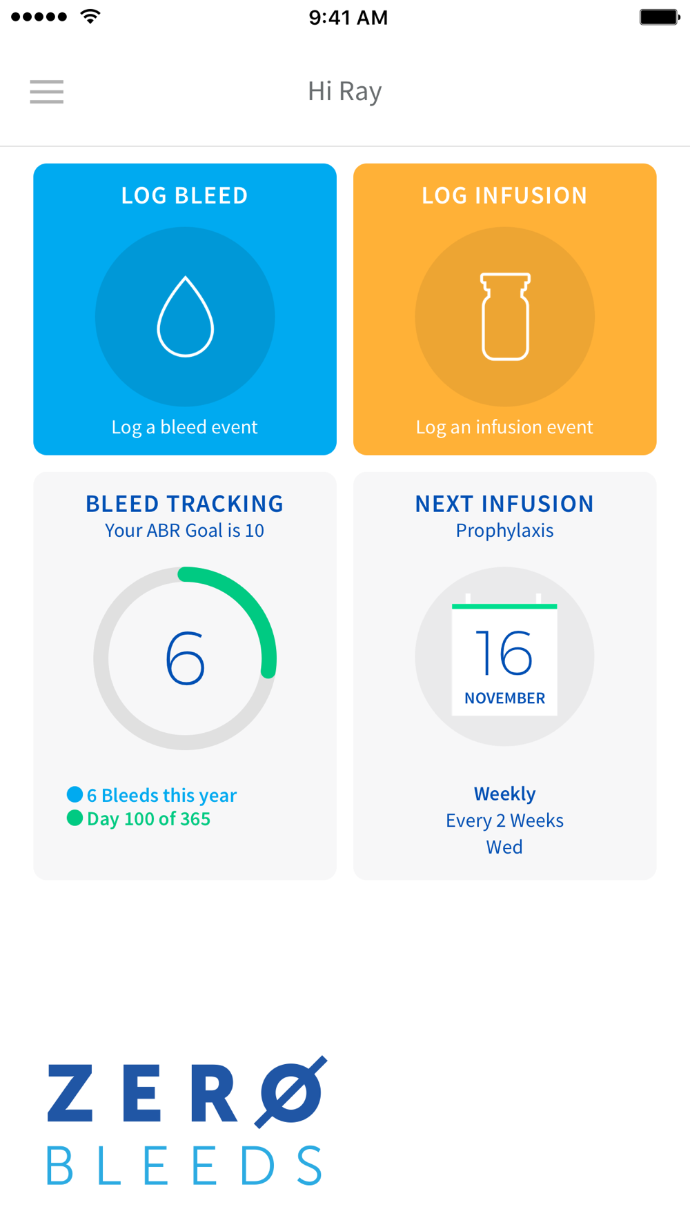 Zero Bleeds is a secure digital logbook to record your bleed incidents and manage your infusion schedule. Its intuitive design allows you to manage your activities with ease.
