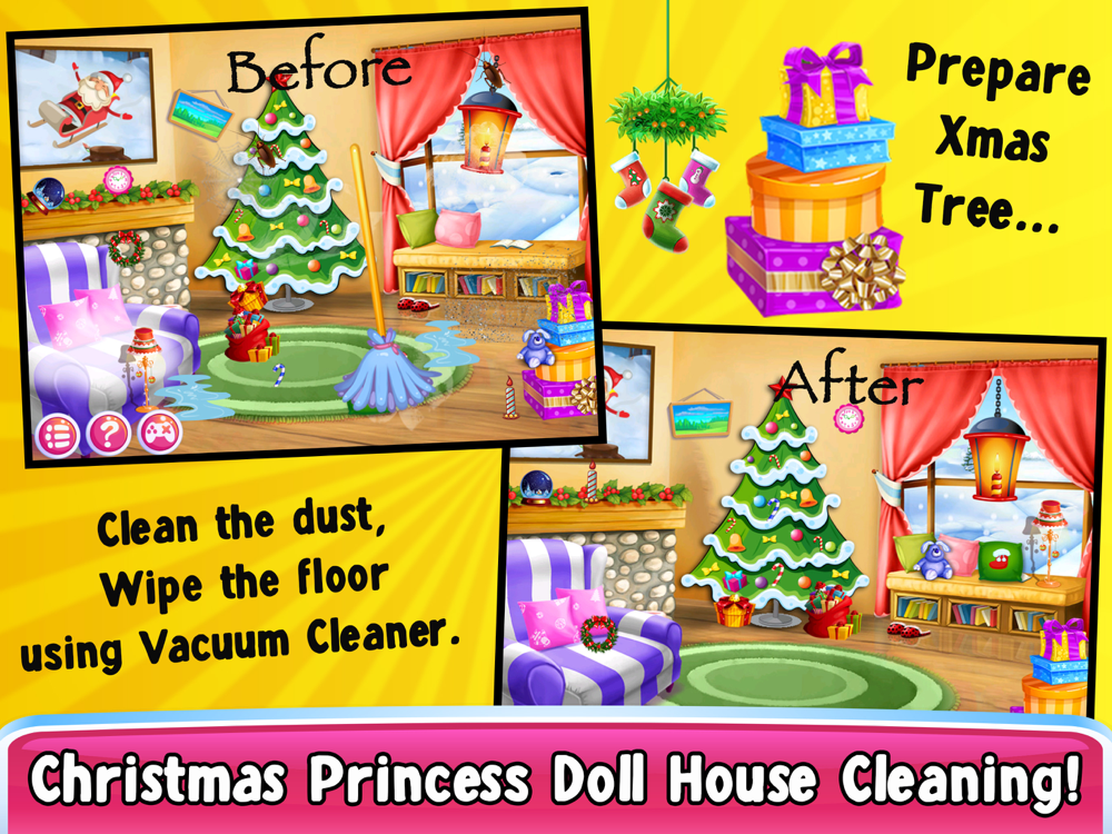 Cleanup & decorate this all new little Christmas princess doll house! The little cute princess wants your help to give her dollhouse a special Christmas makeover. Cleanup this princess bedroom, living room, bathroom & many more rooms!