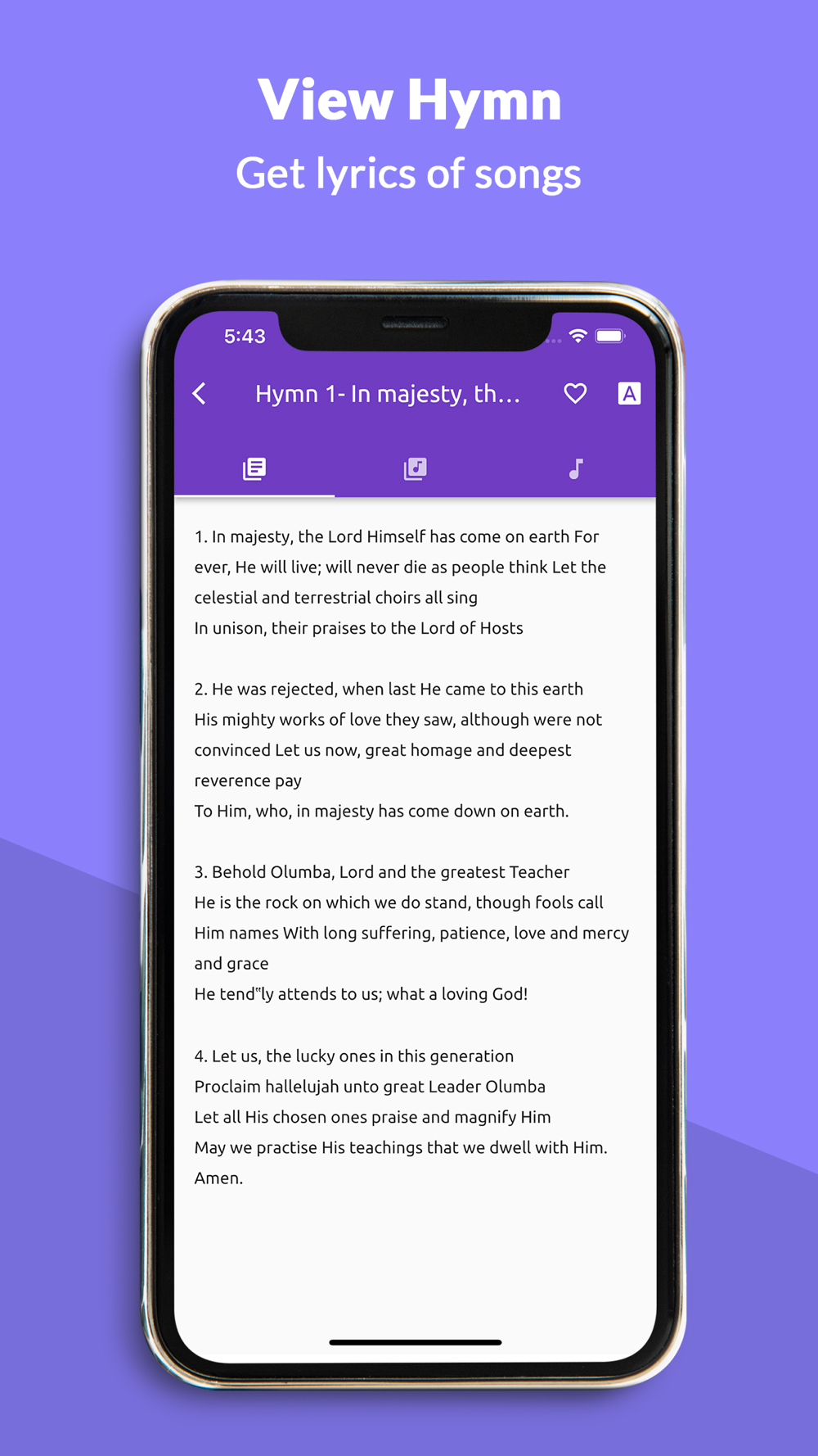 This mobile app contains all the hymns rightly written, composed and owned by Brotherhood of the Cross and Star through the inspiration of the Holy Spirit personified, Leader Olumba Olumba Obu, the Sole Spiritual Head of the Universe and His Christ, His Holiness Olumba Olumba Obu, King of Kings and Lord of Lords, Leader, Unified Universal theocratic council.