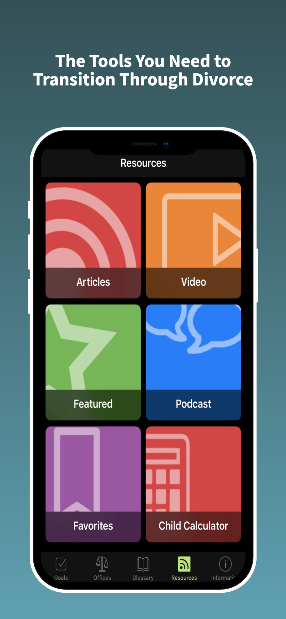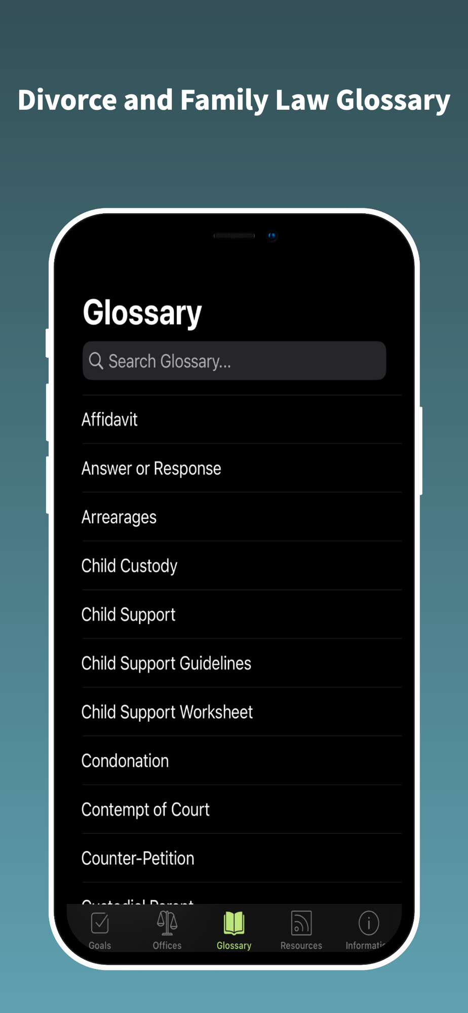 Goals - Explore decisions you and your attorney will make during divorce. Quickly identify laws in your state. With an easy-to-use card interface, you can save goals for future reference.