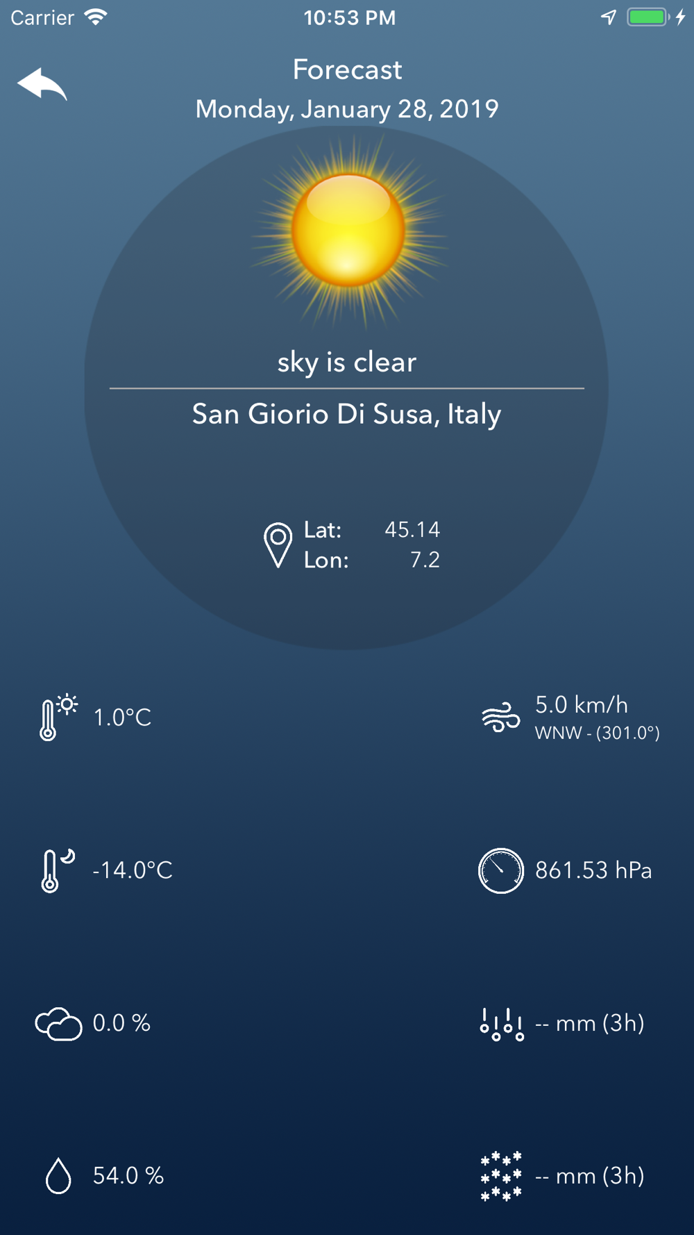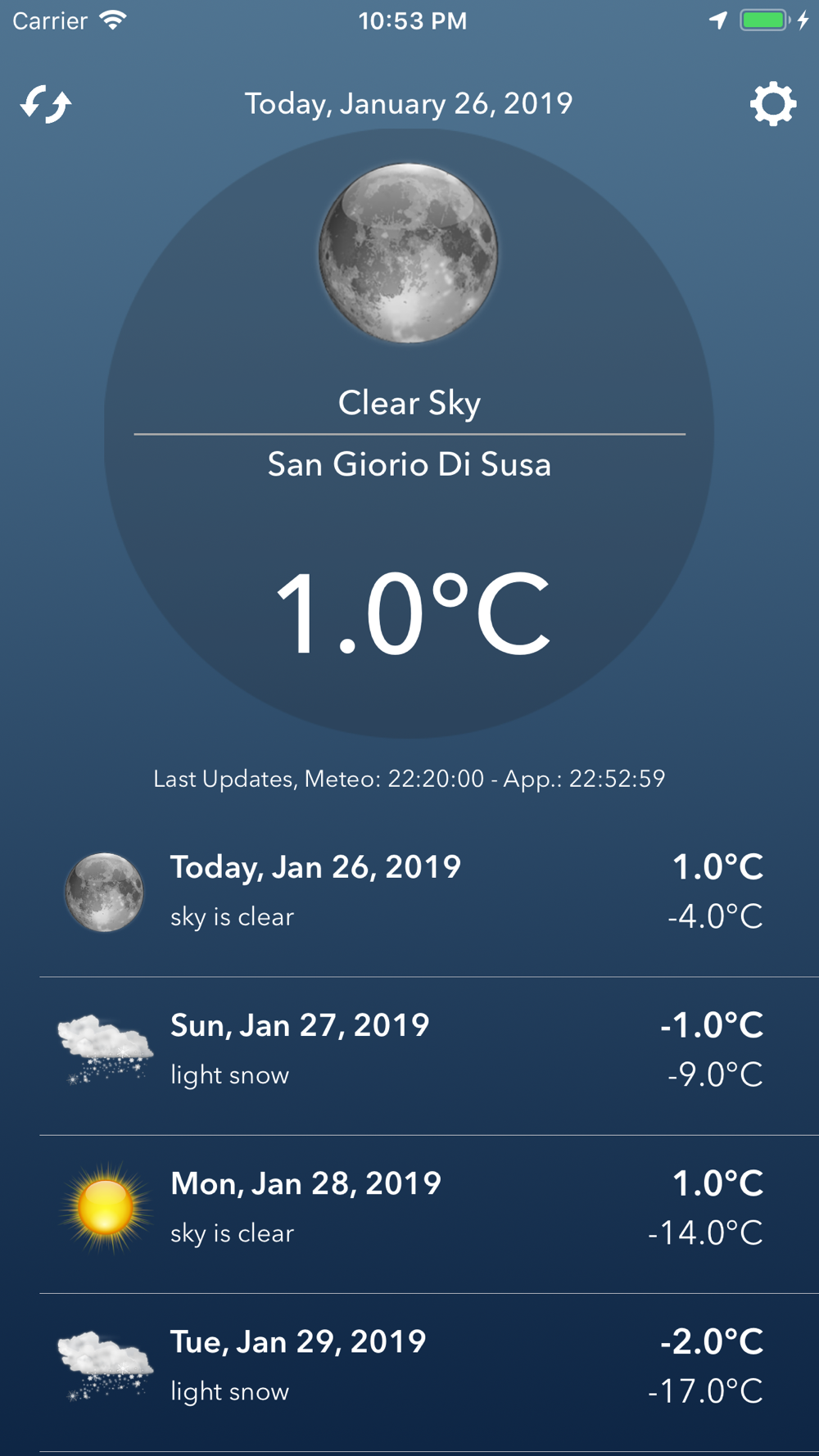The application is very simple and intuitive: at startup, or when the app will return to foreground or through the user manual update, it detects the location using the GPS, and provides the current local weather and forecasts with up to 7 days, offering a series of essential data useful for understanding the evolution of the weather at a glance.