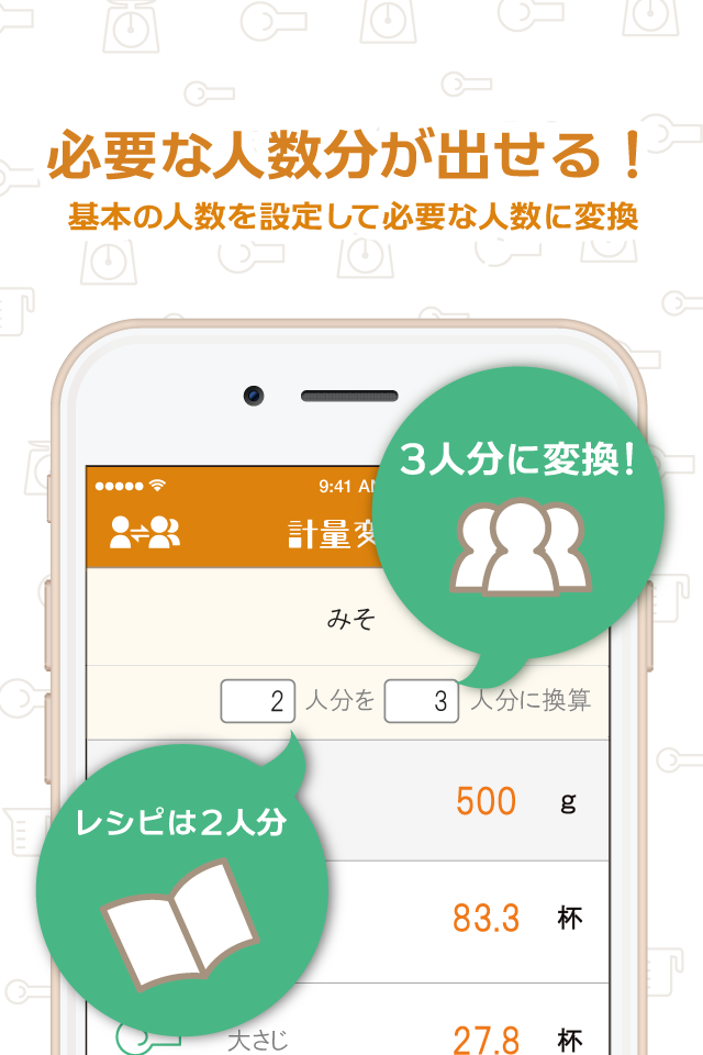 さらに変換人数を設定しておけば、1タップで知りたい人数分の分量に変換できる機能も搭載しています。(Ver.1.3の新機能)