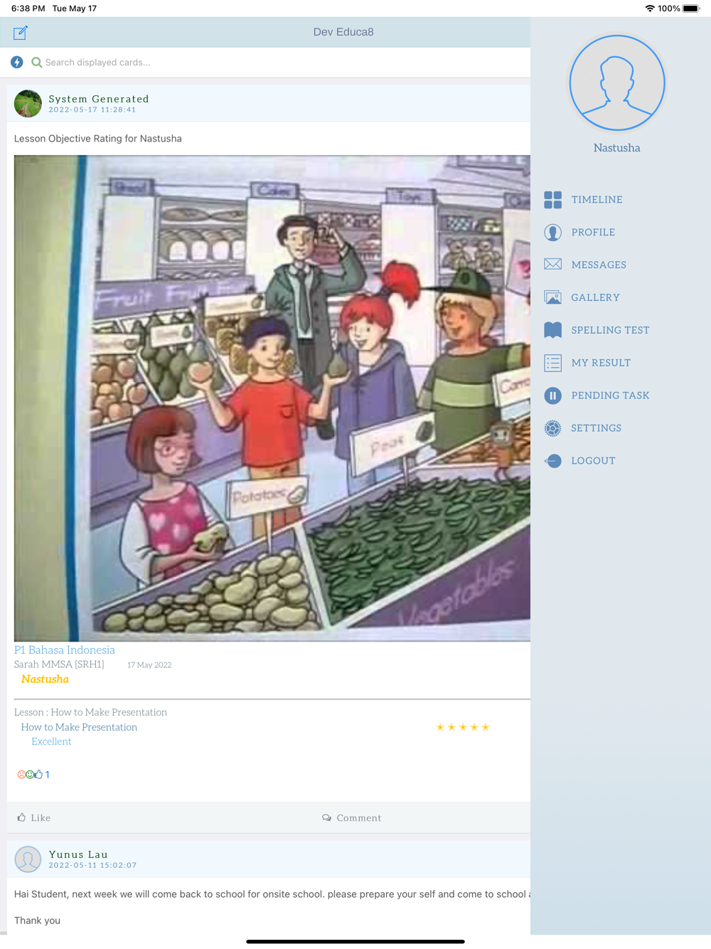 This version contains info cards, communication systems between teachers and students, event related information, upcoming tests, student test result information, and photo gallery.