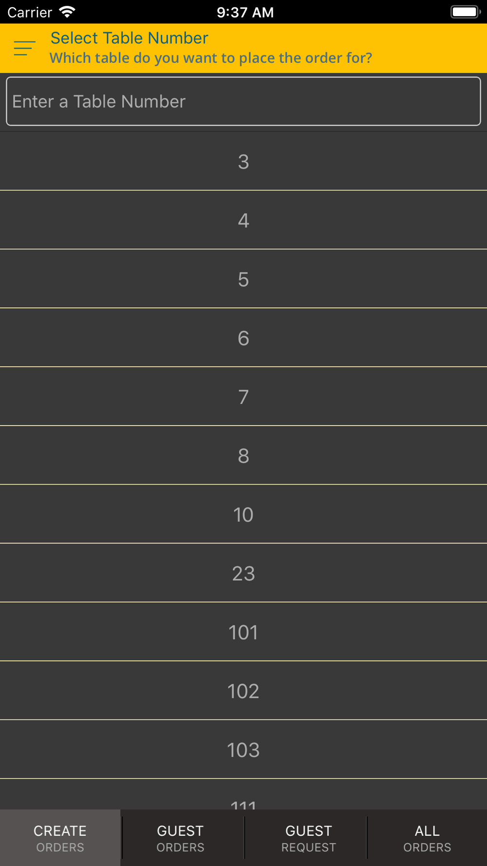 Place orders - select a table or location within the bar, choose the item for order, enter a quantity and place the order on behalf of the customer