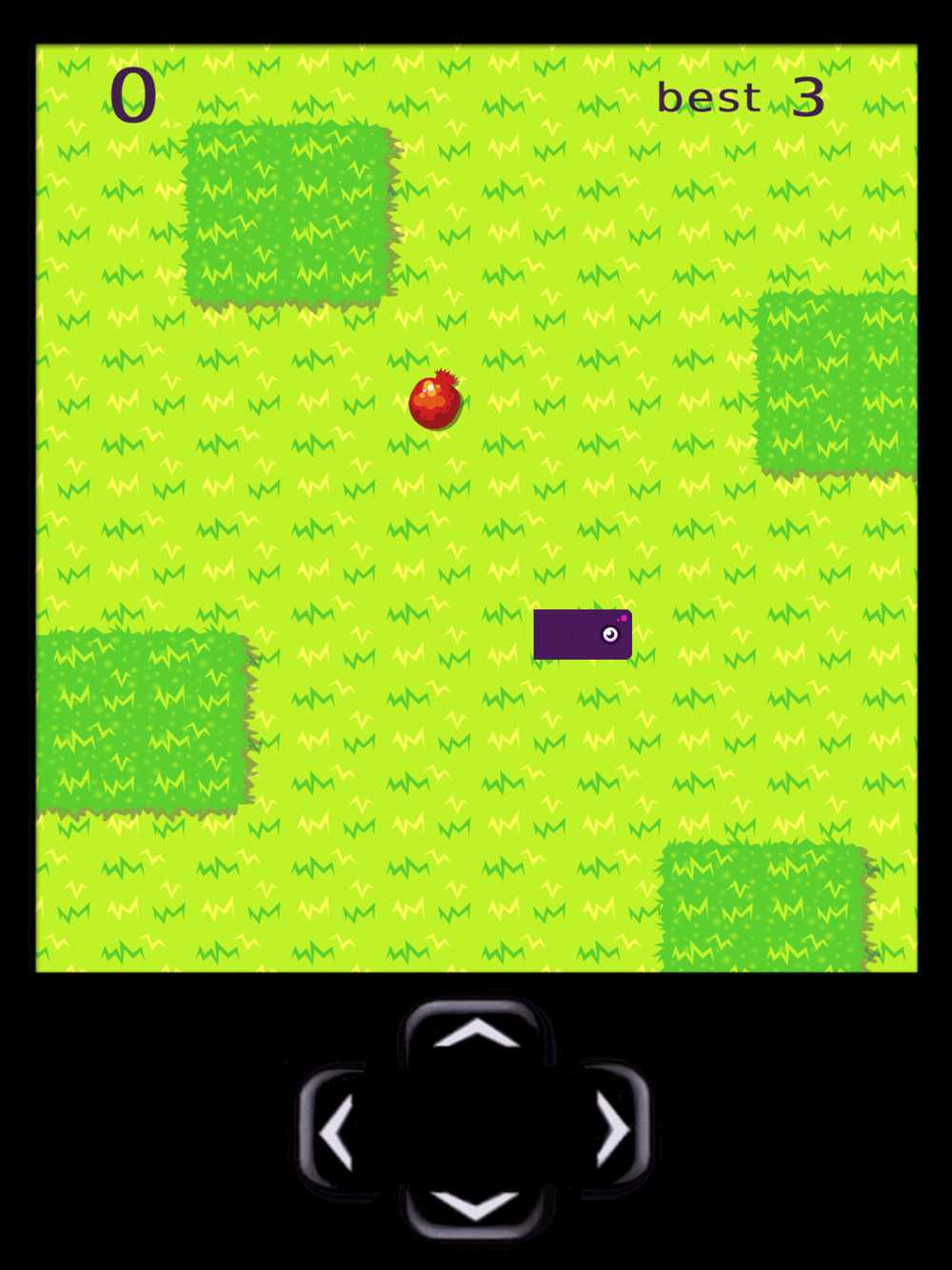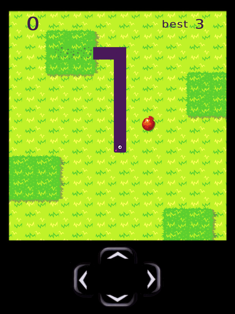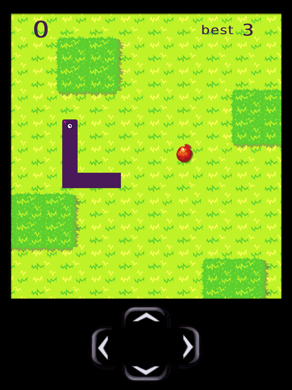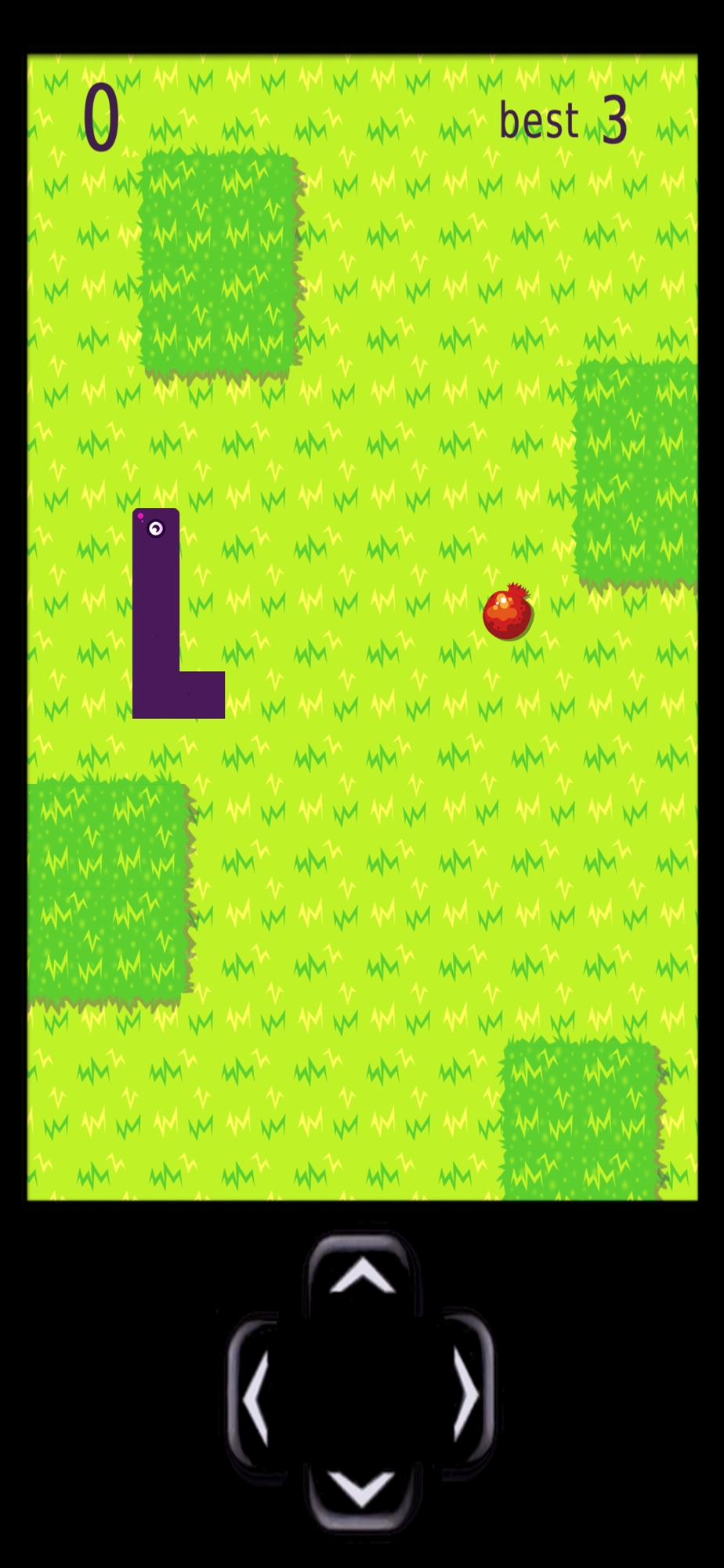 Move the purple hungry worm by pressing the cellphone shaped buttons and eat the red fruits,