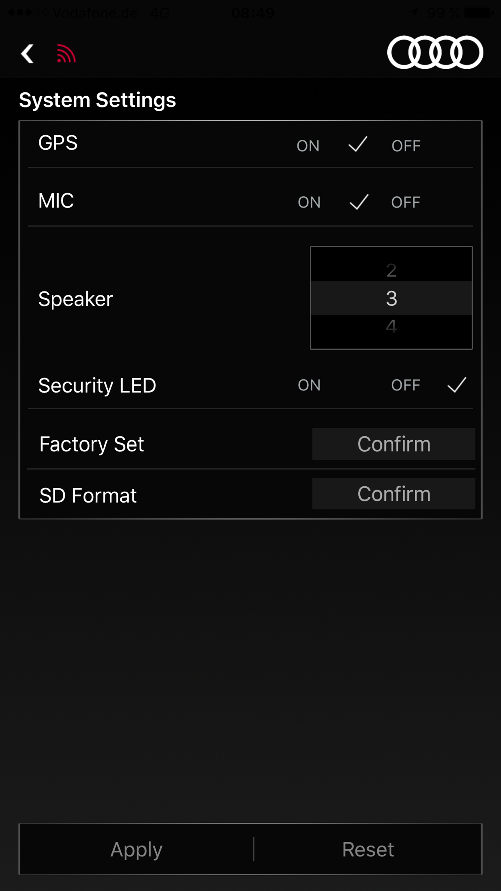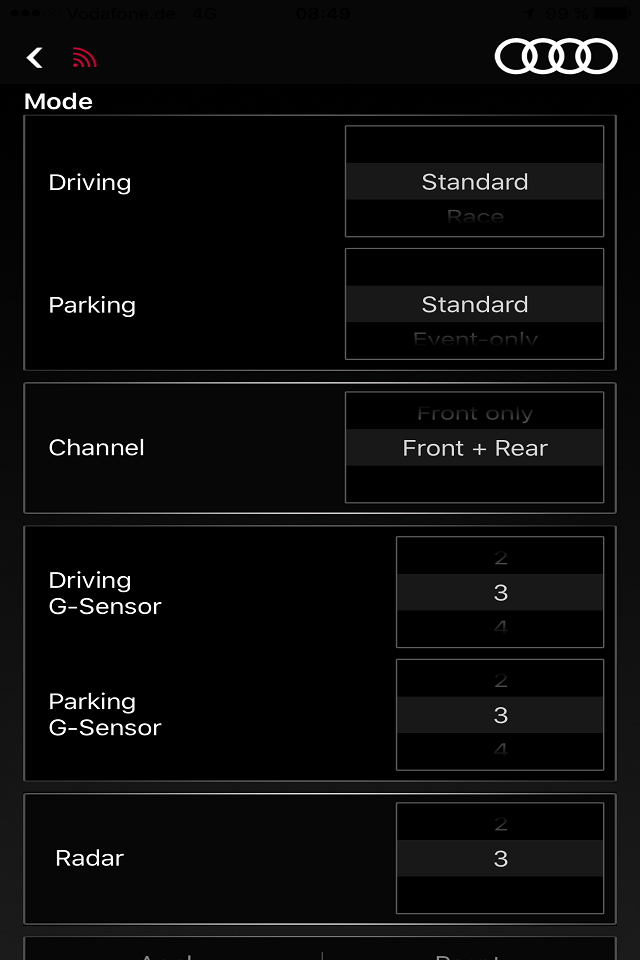 The Audi Universal Traffic Recorder App (“UTR App”) is only for use in combination with the Universal Traffic Recorder (“UTR/Dashcam”) of Audi Genuine Accessories. Its capabilities include live viewing, data management, a car finder function and being able to adjust the recorder‘s settings. All functions of the Audi UTR app require a Wi-Fi connection between the Universal Traffic Recorder and your smartphone.