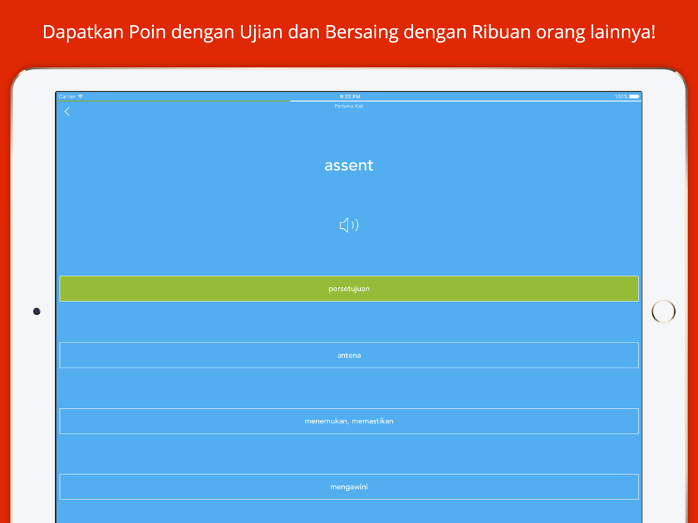 Anda bisa menguji diri Anda sendiri, mengulang kata yang sudah Anda pelajari (dan yang belum) dan terus menerus meningkatkan kosa kata Bahasa Inggris. Anda bisa bersaing dengan ribuan pengguna melalui Game Center dan menjadi yang terbaik!