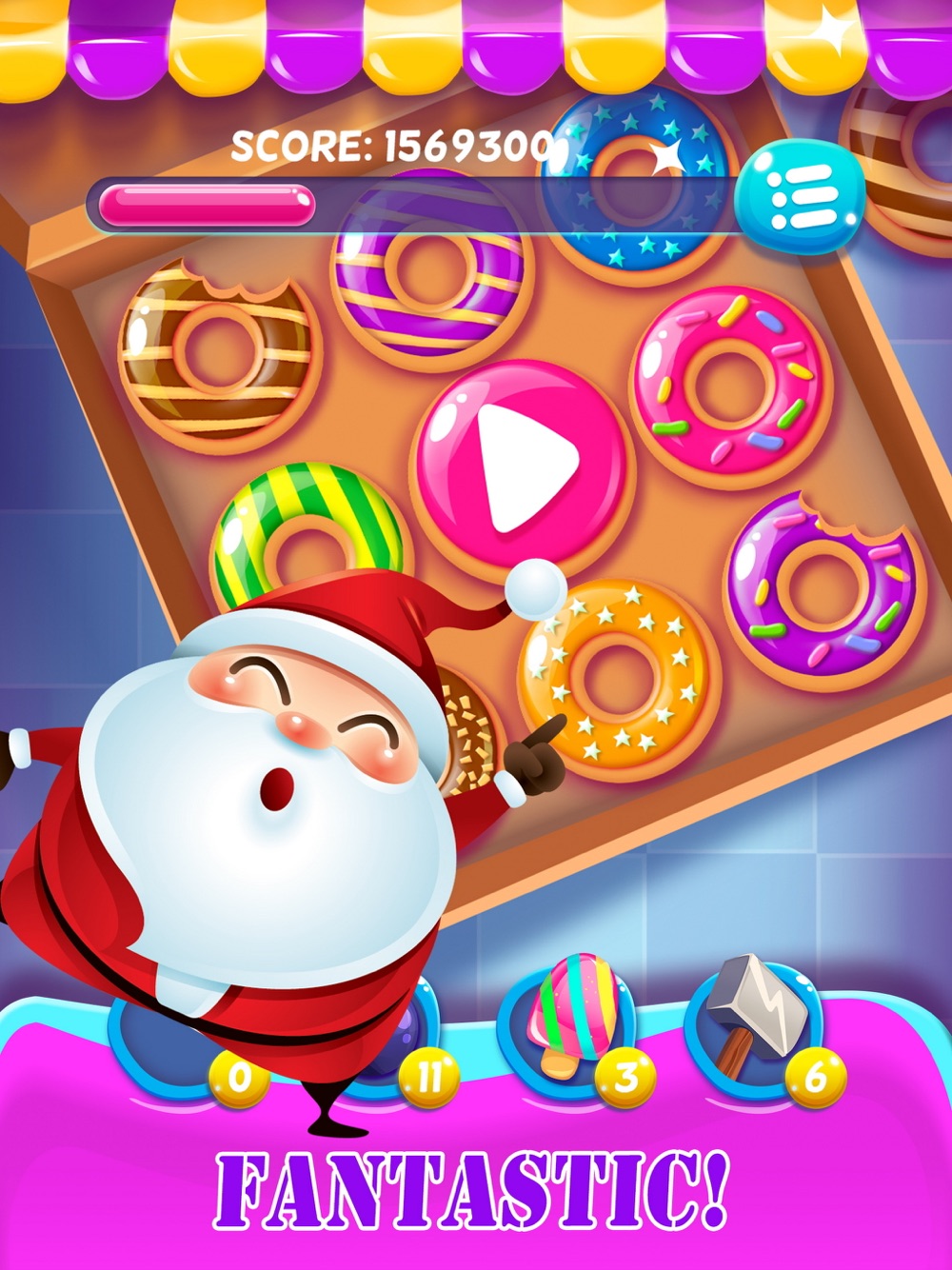 サンタさんがクリスマスパーティーで子供たちのためにプレゼントを持ってくるために、より多くのドーナツを手伝ってください! 作る