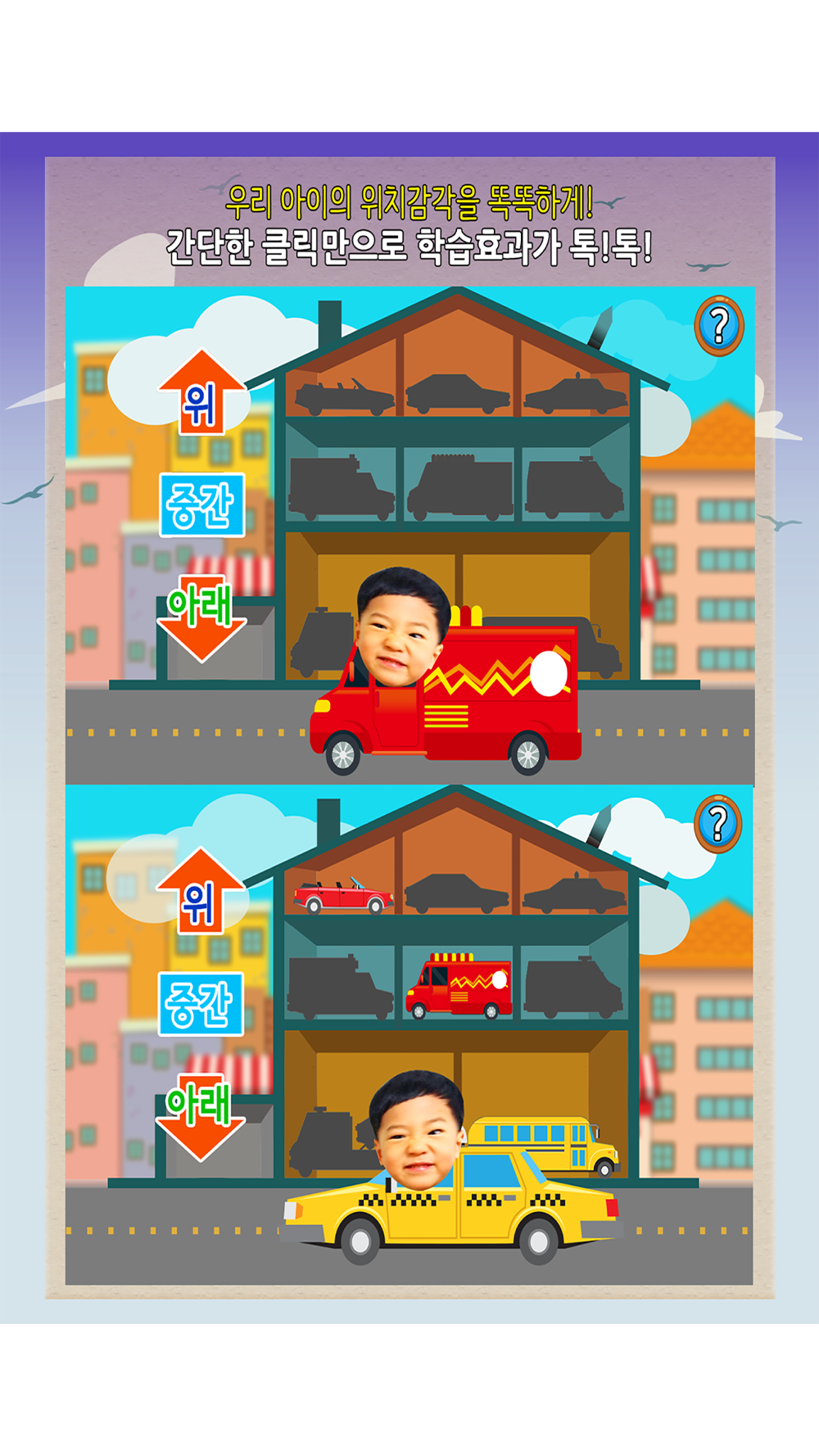 아이가 탄 다양한 차들을 위치에 맞게 주차해요!